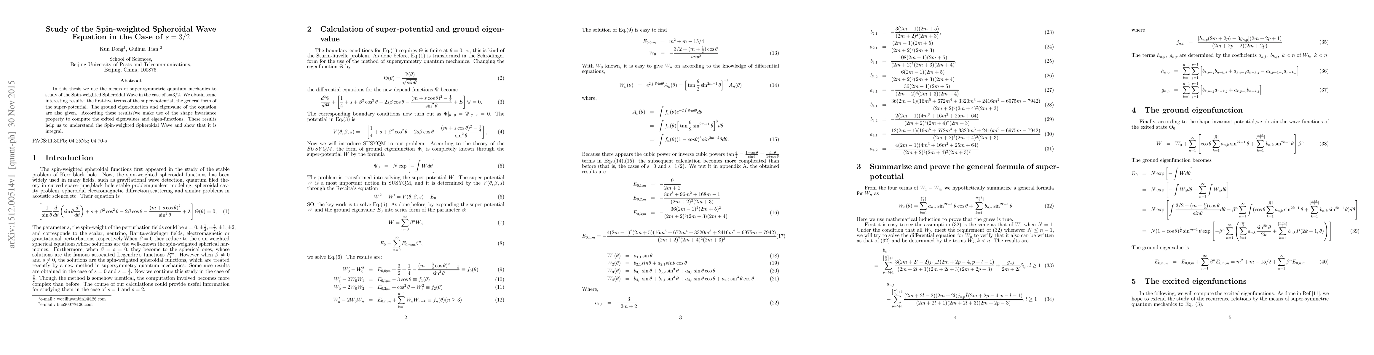Researchers studied the Spin-weighted Spheroidal Wave Equation for s=3/2 using super-symmetric quantum mechanics, finding interesting results on eigenvalues and eigenfunctions that demonstrate its integrality.