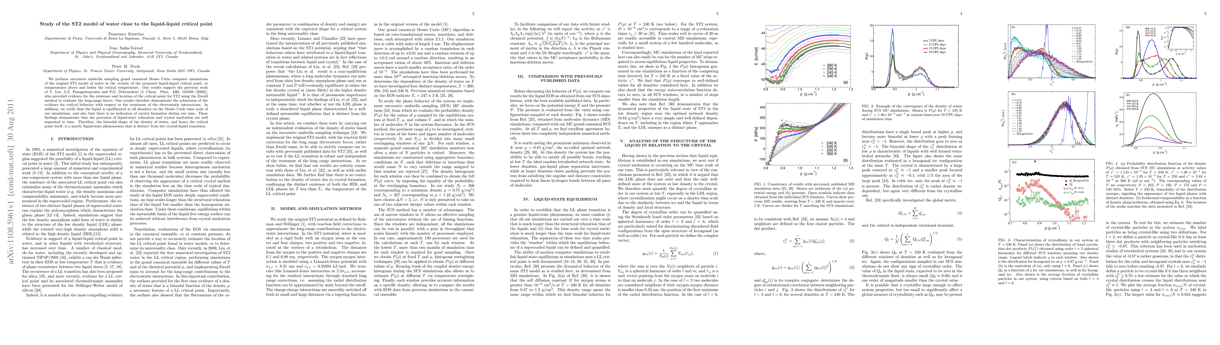 We perform successive umbrella sampling grand canonical Monte Carlo computer simulations of the original ST2 model of water in the vicinity of the proposed liquid-liquid critical point, at temperatures above and below the critical temperature. Our results support the previous work of Y. Liu, A.Z. Panagiotopoulos and P.G. Debenedetti [J. Chem. Phys. {\bf 131}, 104508 (2009)], who provided evidence for the existence and location of the critical point for ST2 using the Ewald method to evaluate the long-range forces. Our results therefore demonstrate the robustness of the evidence for critical behavior with respect to the treatment of the electrostatic interactions. In addition, we verify that the liquid is equilibrated at all densities on the Monte Carlo time scale of our simulations, and also that there is no indication of crystal formation during our runs. These findings demonstrate that the processes of liquid-state relaxation and crystal nucleation are well separated in time. Therefore, the bimodal shape of the density of states, and hence the critical point itself, is a purely liquid-state phenomenon that is distinct from the crystal-liquid transition.