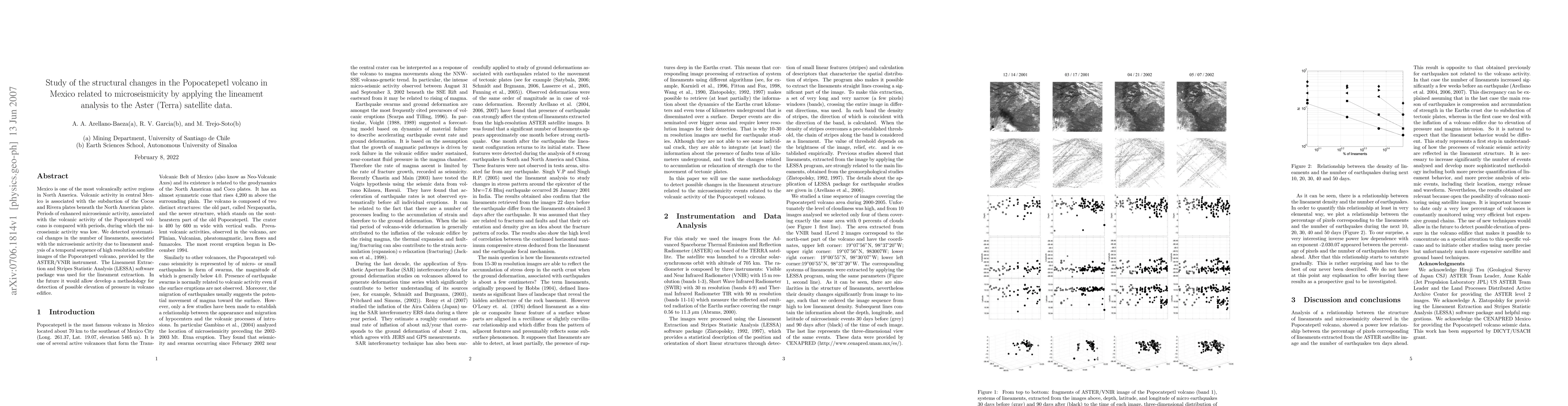 This study examines structural changes in the Popocatepetl volcano linked to microseismicity using lineament analysis on ASTER satellite data. Systematic variations in the number of lineaments were detected correlating with periods of high and low microseismic activity, suggesting a potential method for predicting volcanic pressure buildup.