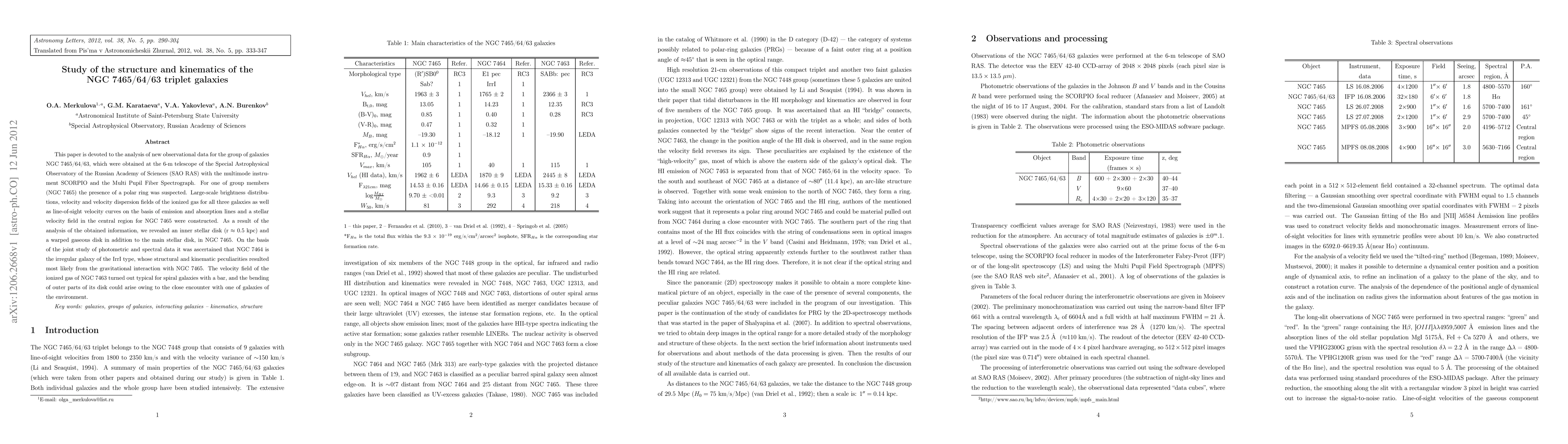 This paper is devoted to the analysis of new observational data for the group of galaxies NGC 7465/64/63, which were obtained at the 6-m telescope of the Special Astrophysical Observatory of the Russian Academy of Sciences (SAO RAS) with the multimode instrument SCORPIO and the Multi Pupil Fiber Spectrograph. For one of group members (NGC 7465) the presence of a polar ring was suspected. Large-scale brightness distributions, velocity and velocity dispersion fields of the ionized gas for all three galaxies as well as line-of-sight velocity curves on the basis of emission and absorption lines and a stellar velocity field in the central region for NGC 7465 were constructed. As a result of the analysis of the obtained information, we revealed an inner stellar disk (r ~ 0.5 kpc) and a warped gaseous disk in addition to the main stellar disk, in NGC 7465. On the basis of the joint study of photometric and spectral data it was ascertained that NGC 7464 is the irregular galaxy of the IrrI type, whose structural and kinematic peculiarities resulted most likely from the gravitational interaction with NGC 7465. The velocity field of the ionized gas of NGC 7463 turned out typical for spiral galaxies with a bar, and the bending of outer parts of its disk could arise owing to the close encounter with one of galaxies of the environment.