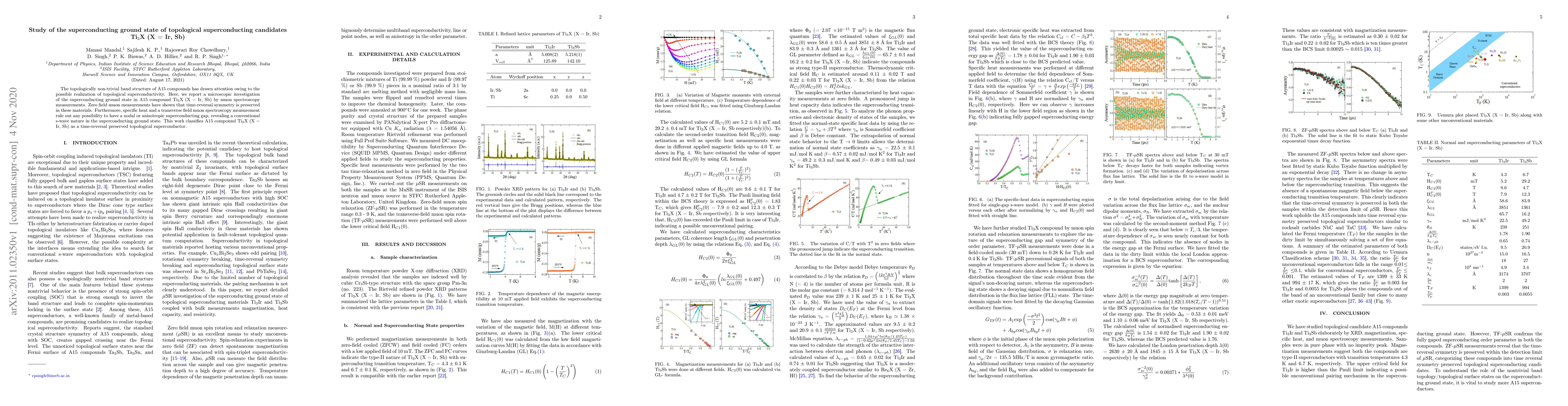 The topologically non-trivial band structure of A15 compounds has drawn attention owing to the possible realization of topological superconductivity. Here, we report a microscopic investigation of the superconducting ground state in A15 compound Ti$_{3}$X (X = Ir, Sb) by muon spectroscopy measurements. Zero field muon measurements have shown that time-reversal symmetry is preserved in these materials. Furthermore, specific heat and a transverse field muon spectroscopy measurement rule out any possibility to have a nodal or anisotropic superconducting gap, revealing a conventional s-wave nature in the superconducting ground state. This work classifies A15 compound Ti$_{3}$X (X = Ir, Sb) as a time-reversal preserved topological superconductor.