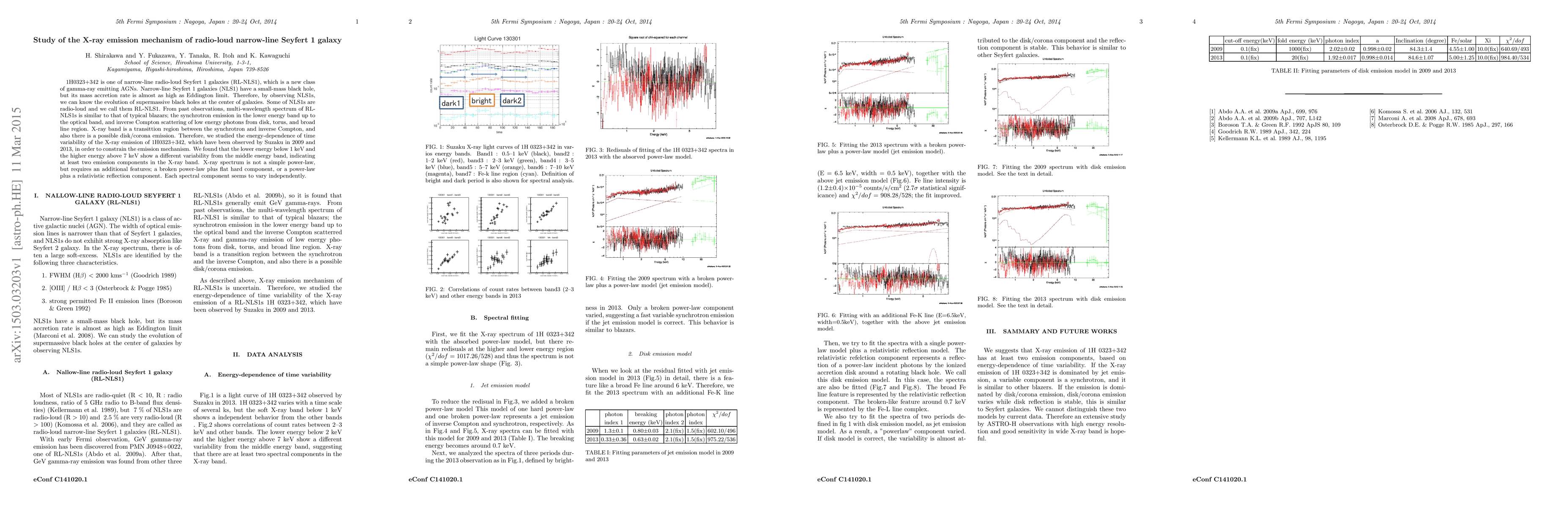 1H0323+342 is one of narrow-line radio-loud Seyfert 1 galaxies (RL-NLS1), which is a new class of gamma-ray emitting AGNs. Narrow-line Seyfert 1 galaxies (NLS1) have a small-mass black hole, but its mass accretion rate is almost as high as Eddington limit. Therefore, by observing NLS1s, we can know the evolution of supermassive black holes at the center of galaxies. Some of NLS1s are radio-loud and we call them RL-NLS1. From past observations, multi-wavelength spectrum of RL-NLS1s is similar to that of typical blazars; the synchrotron emission in the lower energy band up to the optical band, and inverse Compton scattering of low energy photons from disk, torus, and broad line region. X-ray band is a transittion region between the synchrotron and inverse Compton, and also there is a possible disk/corona emission. Therefore, we studied the energy-dependence of time variability of the X-ray emission of 1H0323+342, which have been observed by Suzaku in 2009 and 2013, in order to constrain the emission mechanism. We found that the lower energy below 1 keV and the higher energy above 7 keV show a different variability from the middle energy band, indicating at least two emission components in the X-ray band. X-ray spectrum is not a simple power-law, but requires an additional features; a broken power-law plus flat hard component, or a power-law plus a relativistic reflection component. Each spectral component seems to vary independently.