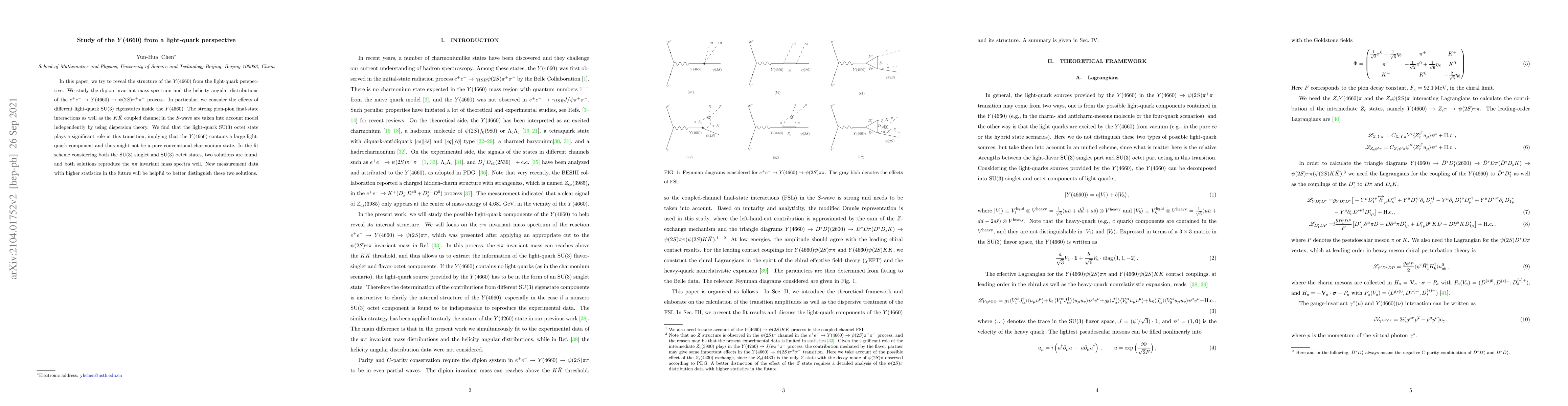 This paper investigates the structure of the $Y(4660)$ particle from the light-quark perspective, analyzing the dipion invariant mass spectrum and helicity angular distributions in the decay process $e^+ e^- \to Y(4660) \to \psi(2S)\pi^+\pi^-$. The study finds that the light-quark SU(3) octet state significantly influences the transition, suggesting the $Y(4660)$ likely contains a substantial light-quark component, challenging its classification as a pure charmonium state.