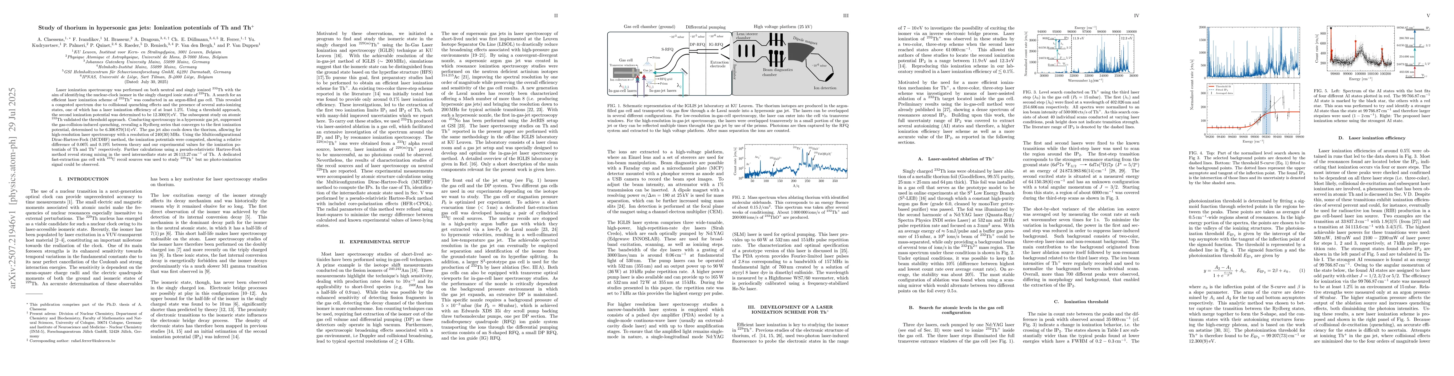 Laser ionization spectroscopy was performed on both neutral and singly ionized $^{232}$Th with the aim of identifying the nuclear-clock isomer in the singly charged ionic state of $^{229}$Th. A search for an efficient laser ionization scheme of $^{232}$Th$^+$ was conducted in an argon-filled gas cell. This revealed a congested spectrum due to collisional quenching effects and the presence of several auto-ionizing states, one of which has a laser ionization efficiency of at least $1.2 \%$. Using a threshold approach, the second ionization potential was determined to be $12.300(9)\,$eV. The subsequent study on atomic $^{232}$Th validated the threshold approach. Conducting spectroscopy in a hypersonic gas jet, suppressed the gas-collision-induced quenching, revealing a Rydberg series that converges to the first ionization potential, determined to be $6.306879(14)\,$eV. The gas jet also cools down the thorium, allowing for high-resolution laser spectroscopy with a resolution of $240(30)\,$MHz. Using the Multiconfigurational Dirac-Hartree-Fock (MCDHF) method, the ionization potentials were computed, showing a relative difference of 0.06\% and 0.19\% between theory and our experimental values for the ionization potentials of Th and Th$^+$ respectively. Further calculations using a pseudo-relativistic Hartree-Fock method reveal strong mixing in the used intermediate state at $26113.27\,$cm$^{-1}$ of Th. A dedicated fast-extraction gas cell with $^{233}$U recoil sources was used to study $^{229}$Th$^+$ but no photo-ionization signal could be observed.