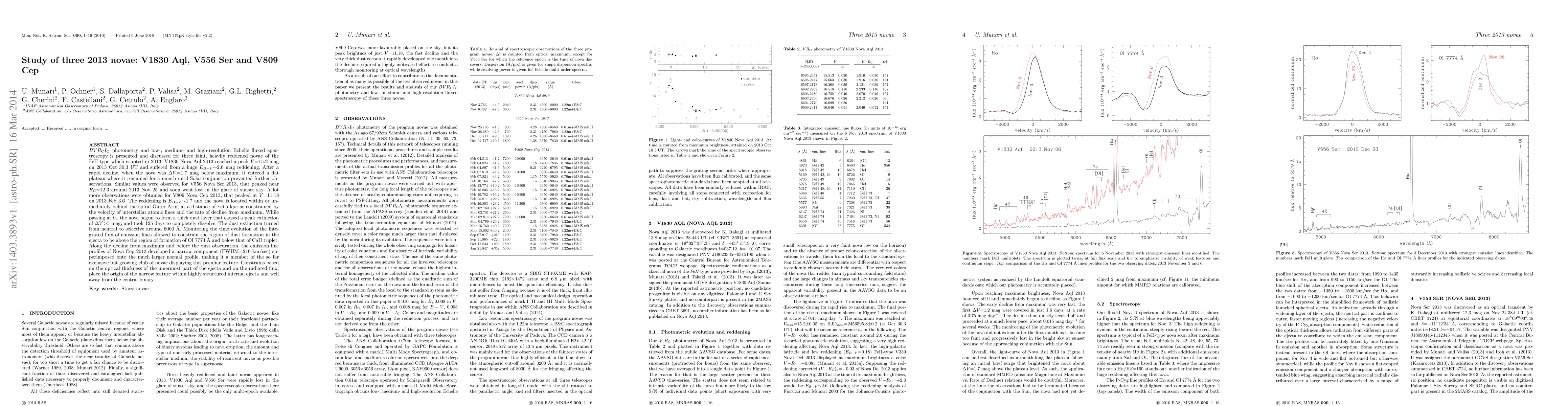 This paper studies three 2013 novae (V1830 Aql, V556 Ser, and V809 Cep) using photometry and spectroscopy to understand their behavior, including a unique narrow component in the emission line profiles of Nova Cep 2013.