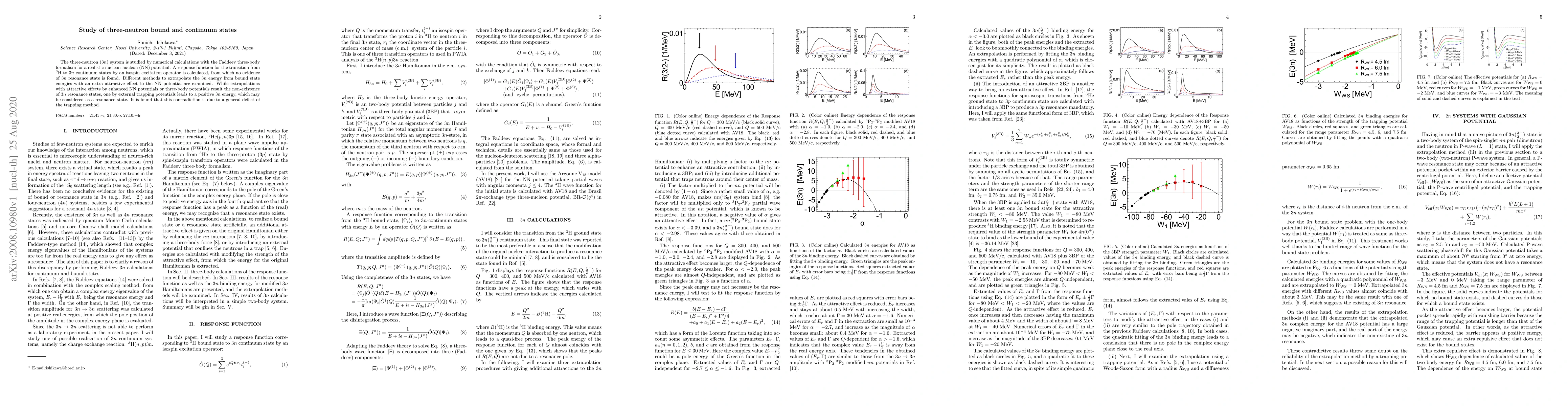 The three-neutron ($3n$) system is studied by numerical calculations with the Faddeev three-body formalism for a realistic nucleon-nucleon (NN) potential. A response function for the transition from ${}^3\mathrm{H}$ to $3n$ continuum states by an isospin excitation operator is calculated, from which no evidence of $3n$ resonance state is found. Different methods to extrapolate the $3n$ energy from bound state energies with an extra attractive effect to the NN potential are examined. While extrapolations with attractive effects by enhanced NN potentials or three-body potentials result the non-existence of $3n$ resonance states, one by external trapping potentials leads to a positive $3n$ energy, which may be considered as a resonance state. It is found that this contradiction is due to a general defect of the trapping method.