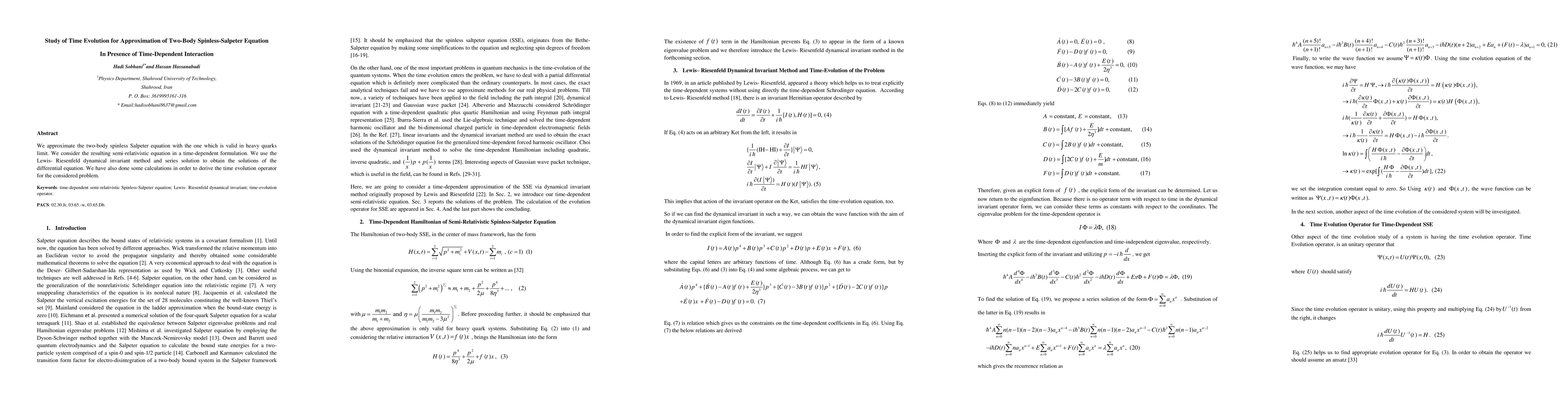 This study approximates the two-body spinless Salpeter equation in the heavy quarks limit, deriving a semi-relativistic time-dependent formulation. The Lewis-Riesenfeld method and series solution are employed to obtain differential equation solutions and derive the time evolution operator.