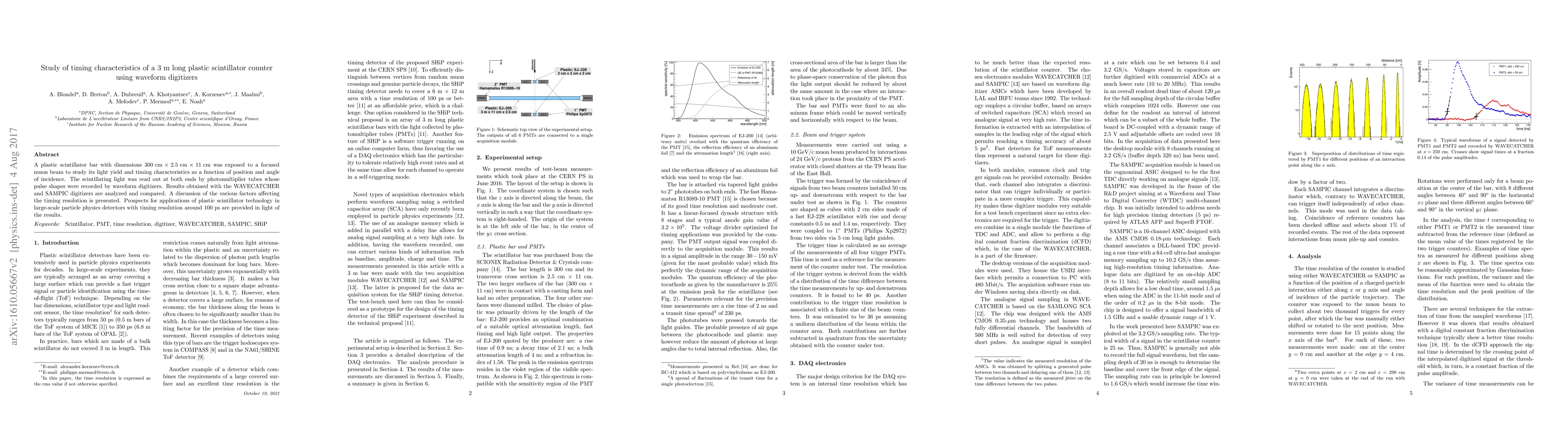 This study investigates the light yield and timing characteristics of a 3 m plastic scintillator counter using waveform digitizers, with results from WAVECATCHER and SAMPIC compared. The findings suggest potential for plastic scintillator technology in particle physics detectors with timing resolutions around 100 ps.