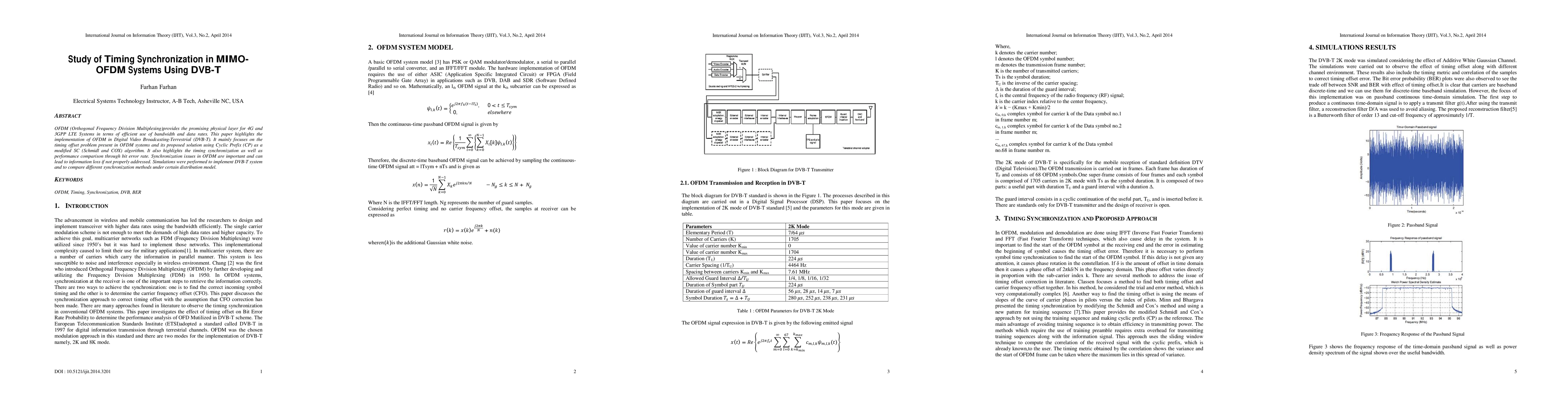 OFDM (Orthogonal Frequency Division Multiplexing)provides the promising physical layer for 4G and 3GPP LTE Systems in terms of efficient use of bandwidth and data rates. This paper highlights the implementation of OFDM in Digital Video Broadcasting-Terrestrial (DVB-T). It mainly focuses on the timing offset problem present in OFDM systems and its proposed solution using Cyclic Prefix (CP) as a modified SC (Schmidl and COX) algorithm. It also highlights the timing synchronization as well as performance comparison through bit error rate. Synchronization issues in OFDM are important and can lead to information loss if not properly addressed. Simulations were performed to implement DVB-T system and to compare different synchronization methods under certain distribution model.