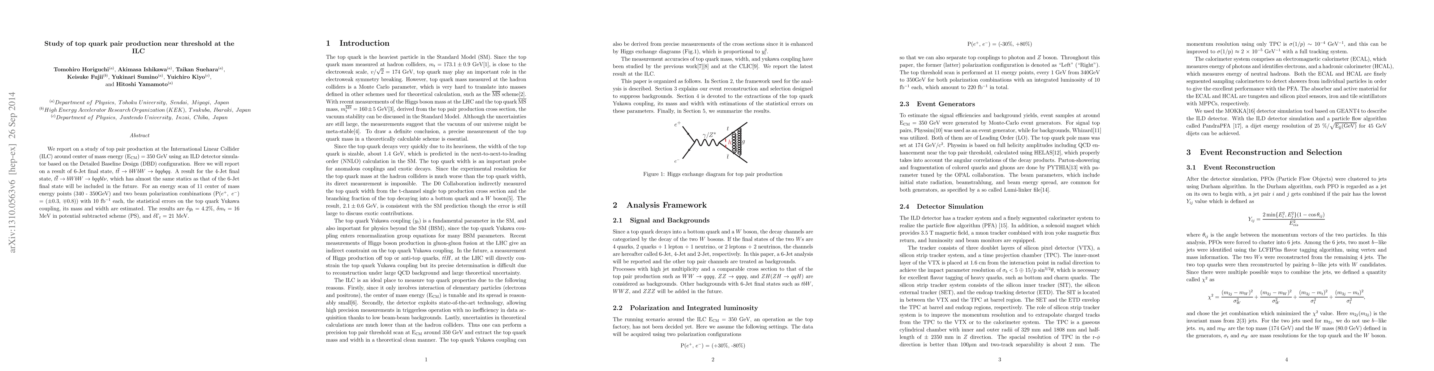 We report on a study of top pair production at the International Linear Collider (ILC) around center of mass energy (E$_{\rm CM}$) = 350 GeV using an ILD detector simulator based on the Detailed Baseline Design (DBD) configuration. Here we will report on a result of 6-Jet final state, $t\ bar{t} \rightarrow bWbW \rightarrow bqqbqq$. A result for the 4-Jet final state, $t\ bar{t} \rightarrow bWbW \rightarrow bqqbl\nu$, which has almost the same statics as that of the 6-Jet final state will be included in the future. For an energy scan of 11 center of mass energy points (340 - 350GeV) and two beam polarization combinations (P($e^+,\ e^-$) = ($\pm$0.3, $\mp$0.8)) with 10 fb$^{-1}$ each, the statistical errors on the top quark Yukawa coupling, its mass and width are estimated. The results are $\delta y_t$ = 4.2%, $\delta m_t$ = 16 MeV in potential subtracted scheme (PS), and $\delta \Gamma_t$ = 21 MeV.