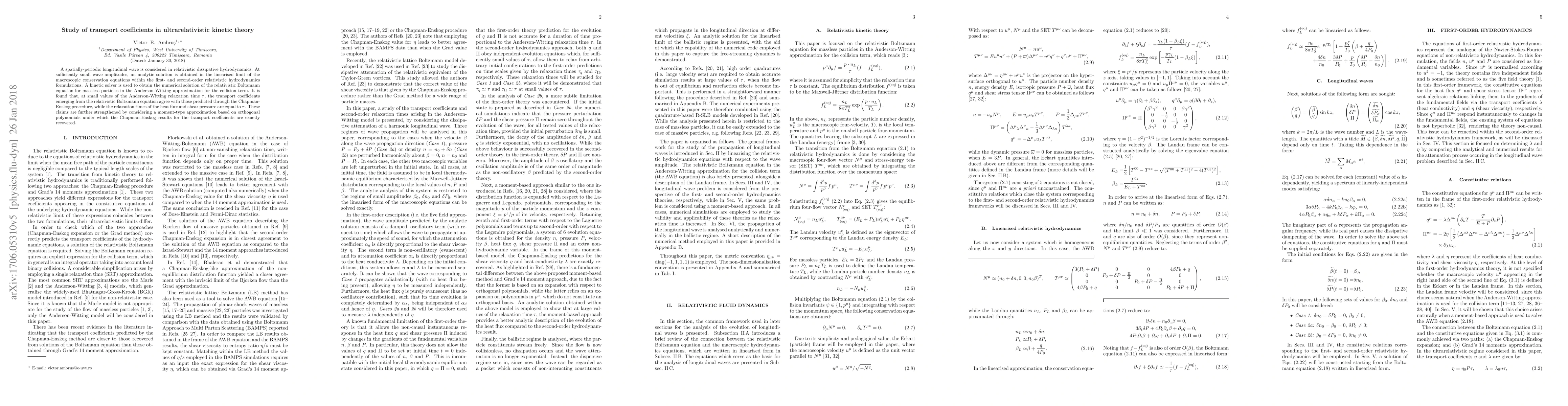 A spatially-periodic longitudinal wave is considered in relativistic dissipative hydrodynamics. At sufficiently small wave amplitudes, an analytic solution is obtained in the linearised limit of the macroscopic conservation equations within the first- and second-order relativistic hydrodynamics formulations. A kinetic solver is used to obtain the numerical solution of the relativistic Boltzmann equation for massless particles in the Anderson-Witting approximation for the collision term. It is found that, at small values of the Anderson-Witting relaxation time $\tau$, the transport coefficients emerging from the relativistic Boltzmann equation agree with those predicted through the Chapman-Enskog procedure, while the relaxation times of the heat flux and shear pressure are equal to $\tau$. These claims are further strengthened by considering a moment-type approximation based on orthogonal polynomials under which the Chapman-Enskog results for the transport coefficients are exactly recovered.