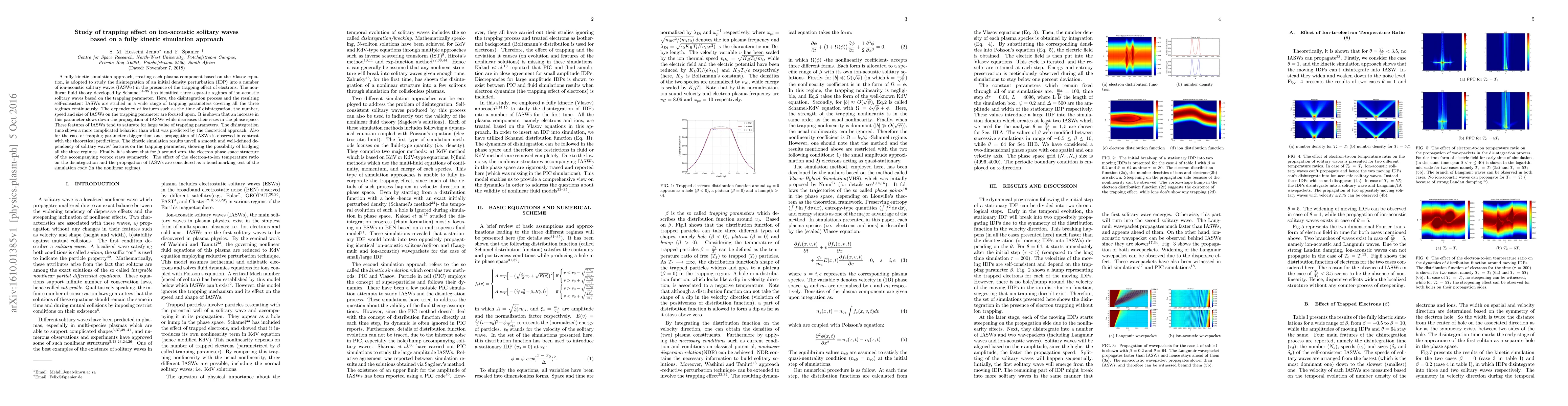 A fully kinetic simulation approach, treating each plasma component based on the Vlasov equation, is adopted to study the disintegration of an initial density perturbation (IDP) into a number of ion-acoustic solitary waves (IASWs) in the presence of the trapping effect of electrons. The non-linear fluid theory developed by Schamel has identified three separate regimes of ion-acoustic solitary waves based on the trapping parameter. Here, the disintegration process and the resulting self-consistent IASWs are studied in a wide range of trapping parameters covering all the three regimes continuously. The dependency of features such as the time of disintegration, the number, speed and size of IASWs on the trapping parameter are focused upon. It is shown that an increase in this parameter slows down the propagation of IASWs while decreases their sizes in the phase space. These features of IASWs tend to saturate for large value of trapping parameters. The disintegration time shows a more complicated behavior than what was predicted by the theoretical approach. Also for the case of trapping parameters bigger than one, propagation of IASWs is observed in contrast with the theoretical predictions. The kinetic simulation results unveil a smooth and well-defined dependency of solitary waves' features on the trapping parameter, showing the possibility of bridging all the three regimes. Finally, it is shown that for beta around zero, the electron phase space structure of the accompanying vortex stays symmetric. The effect of the electron-to-ion temperature ratio on the disintegration and the propagation of IASWs are considered as a benchmarking test of the simulation code (in the nonlinear regime).