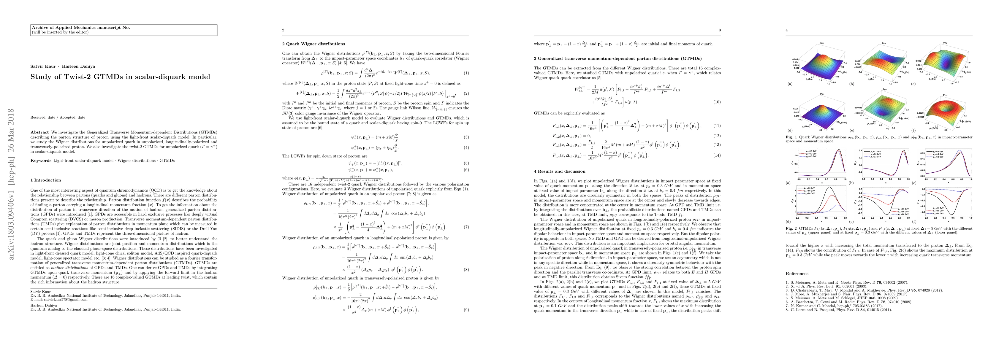 We investigate the Generalized Transverse Momentum-dependent Distributions (GTMDs) describing the parton structure of proton using the light-front scalar-diquark model. In particular, we study the Wigner distributions for unpolarized quark in unpolarized, longitudinally-polarized and transversely-polarized proton. We also investigate the twist-2 GTMDs for unpolarized quark $(\Gamma=\gamma^+)$ in scalar-diquark model.