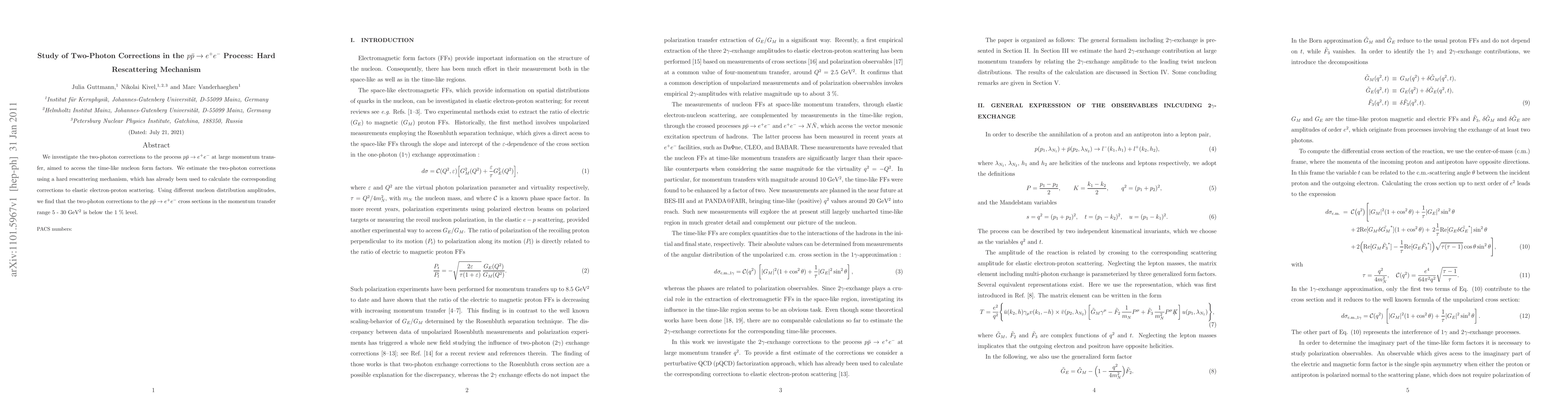 This study examines two-photon corrections in the $p\bar{p} \to e^+e^-$ process at high momentum transfer, focusing on time-like nucleon form factors. The hard rescattering mechanism is employed to estimate these corrections, revealing that they are below 1% in the momentum transfer range of 5 - 30 GeV$^2$.