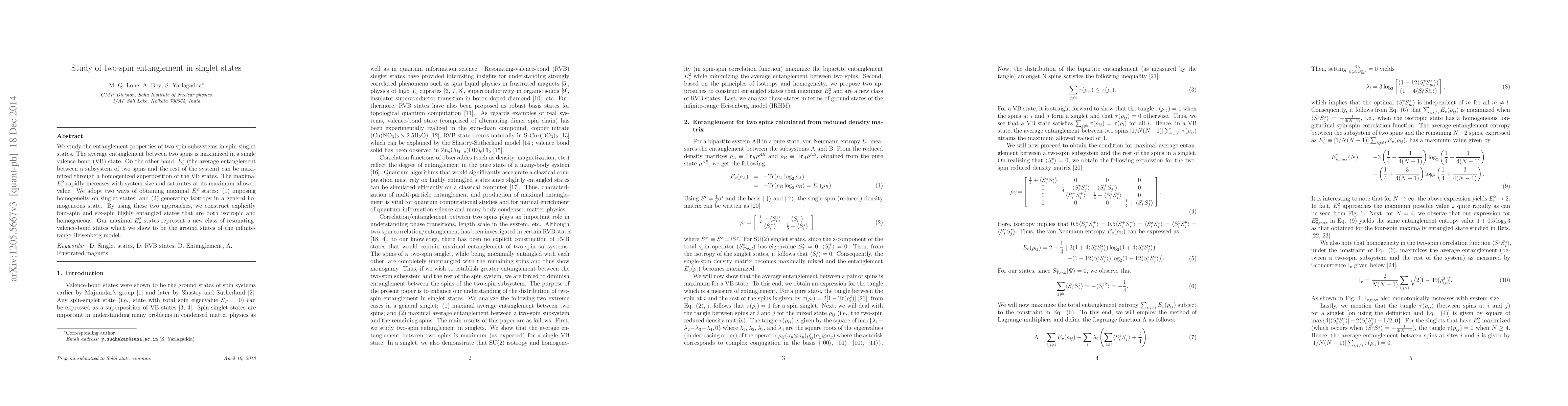 This paper investigates the entanglement properties of two-spin subsystems in spin-singlet states, finding that maximal entanglement can be achieved through a homogenized superposition of valence-bond states. The study constructs highly entangled, isotropic, and homogeneous four-spin and six-spin states, revealing a new class of resonating-valence-bond states that ground the infinite-range Heisenberg model.