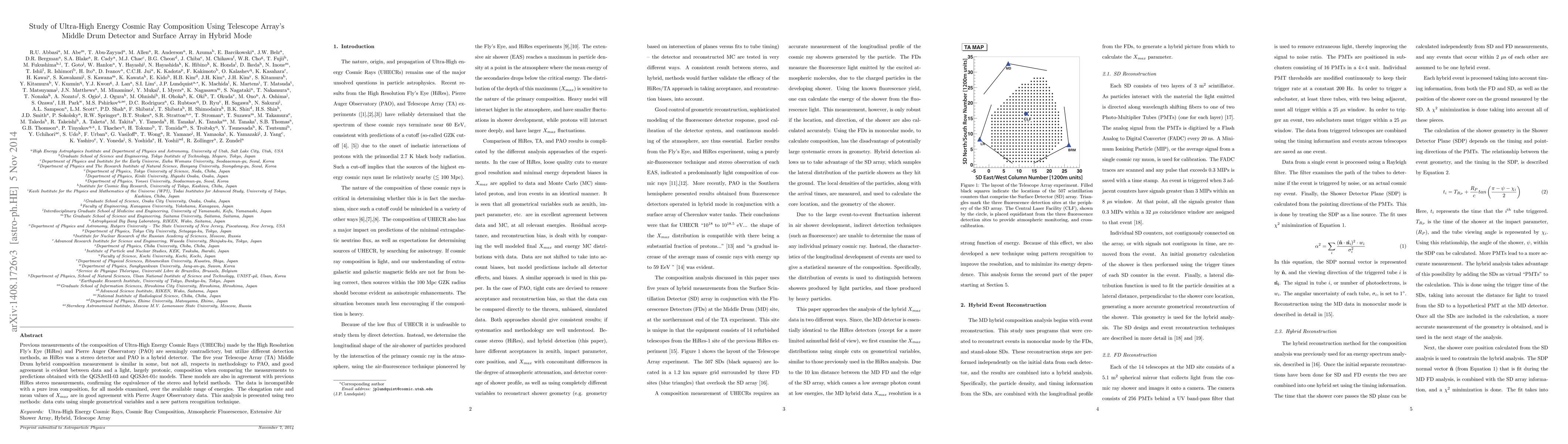 This paper investigates the composition of Ultra-High Energy Cosmic Rays (UHECRs) using the Telescope Array's Middle Drum detector and surface array in hybrid mode, finding agreement with a light, protonic composition model. The study confirms the equivalence of stereo and hybrid detection methods and rejects a pure iron composition, aligning elongation rate and mean Xmax values with Pierre Auger Observatory data.