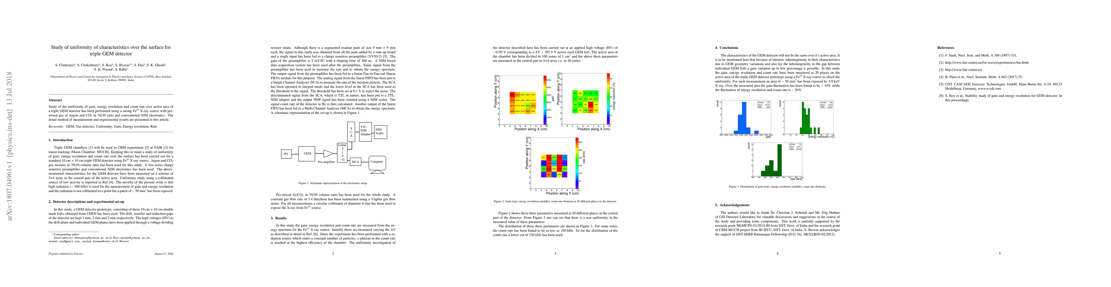 Study of the uniformity of gain, energy resolution and count rate over active area of a triple GEM detector has been performed using a strong Fe55 X-ray source with premixed gas of Argon and CO2 in 70/30 ratio and conventional NIM electronics. The detail method of measurement and experimental results are presented in this article.