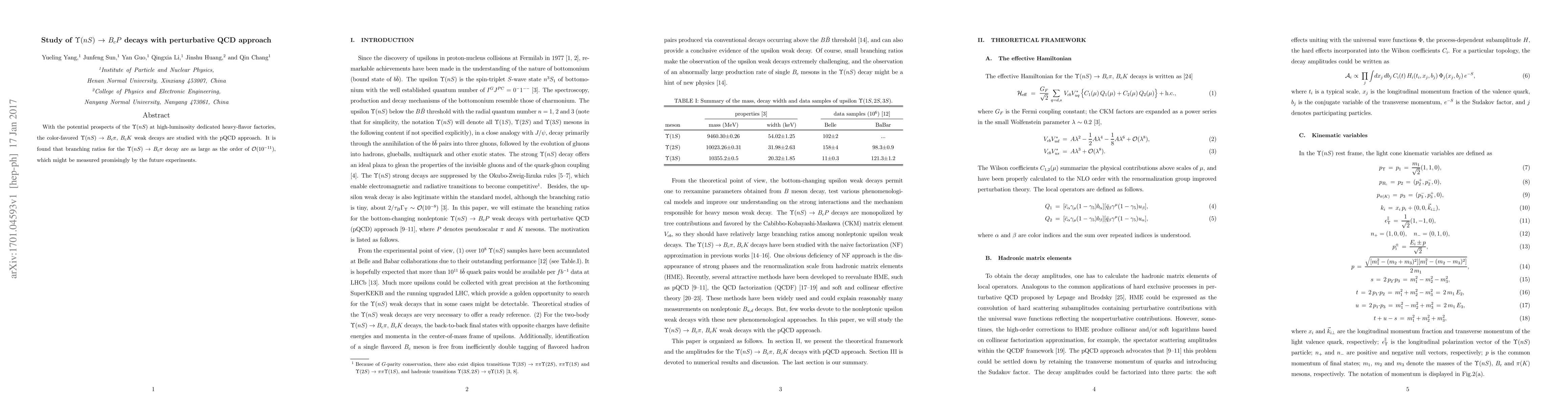 This study investigates the color-favored ${\Upsilon}(nS)$ weak decays into $B_{c}{\pi}$ and $B_{c}K$ using the perturbative QCD approach. The branching ratio for ${\Upsilon}(nS)$ ${\to}$ $B_{c}{\pi}$ is estimated to be ${\cal O}(10^{-11})$, indicating a promising measurement opportunity for future experiments.