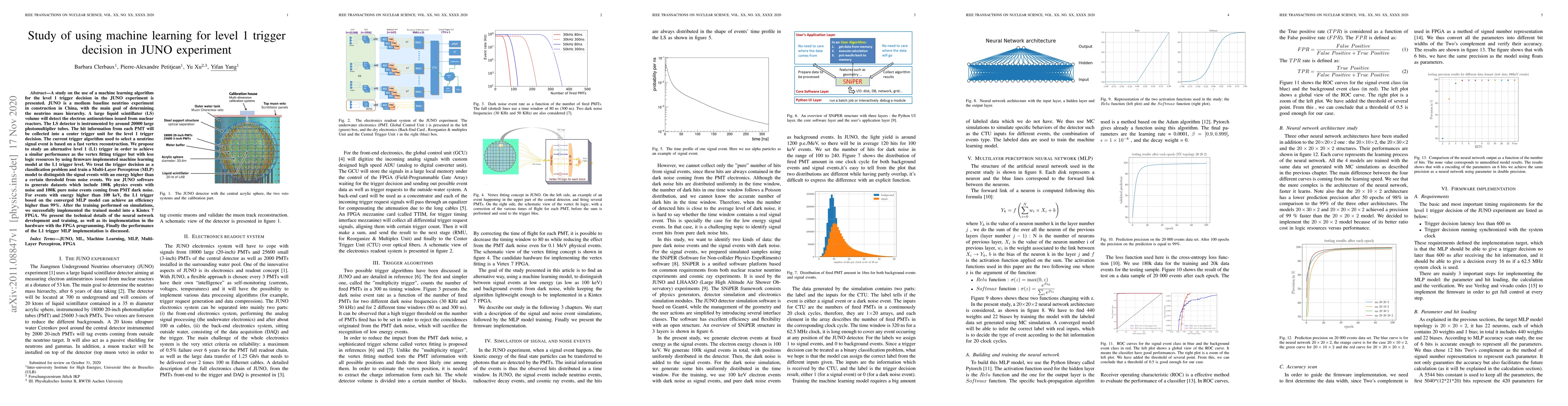 This study explores the application of a machine learning algorithm, specifically a Multi-Layer Perceptron (MLP), to enhance the level 1 trigger decision in the JUNO neutrino experiment. The proposed MLP model, trained on simulated datasets, achieves over 99% efficiency in distinguishing signal events from noise, demonstrating a potential reduction in resource usage compared to traditional vertex fitting methods.