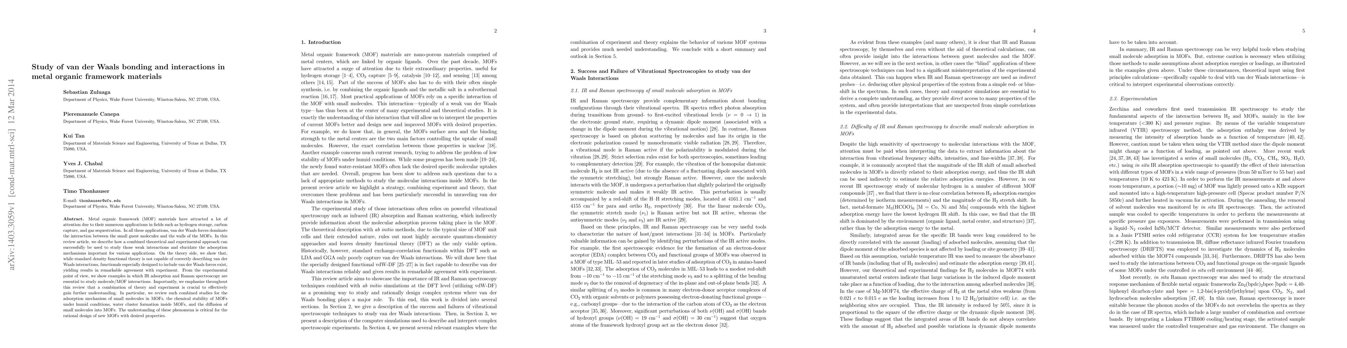 This review explores the role of van der Waals forces in metal organic framework (MOF) materials, emphasizing the importance of combining theoretical and experimental methods to study weak interactions. It highlights the inadequacy of standard density functional theory in describing van der Waals forces and the effectiveness of specialized functionals, alongside the utility of IR and Raman spectroscopy in experimental studies.