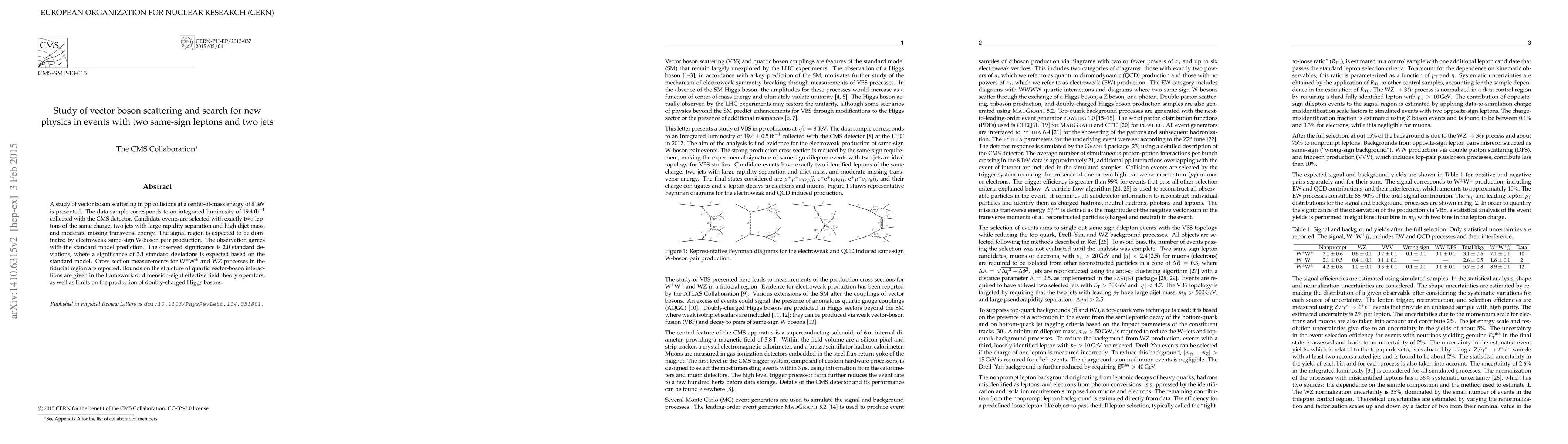 A study of vector boson scattering in pp collisions at a center-of-mass energy of 8 TeV is presented. The data sample corresponds to an integrated luminosity of 19.4 inverse femtobarns collected with the CMS detector. Candidate events are selected with exactly two leptons of the same charge, two jets with large rapidity separation and dijet mass, and moderate missing transverse energy. The signal region is expected to be dominated by electroweak same-sign W-boson pair production. The observation agrees with the standard model prediction. The observed significance is 2.0 standard deviations, where a significance of 3.1 standard deviations is expected based on the standard model. Cross section measurements for W+/- W+/- and WZ processes in the fiducial region are reported. Bounds on the structure of quartic vector-boson interactions are given in the framework of dimension-eight effective field theory operators, as well as limits on the production of doubly-charged Higgs bosons.