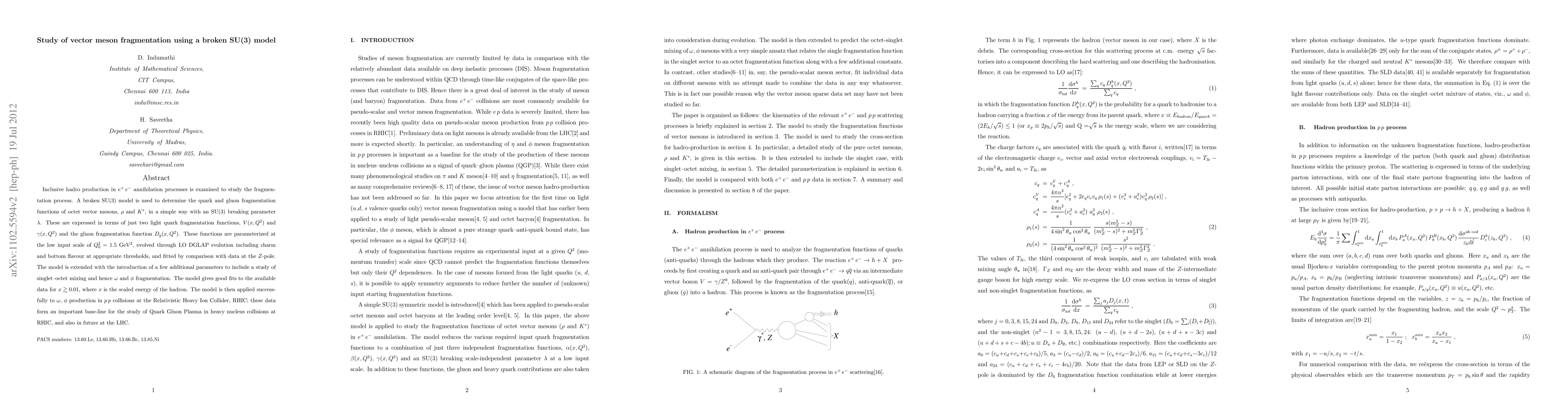 Inclusive hadro production in e^+ e^- annihilation processes is examined to study the fragmentation process. A broken SU(3) model is used to determine the quark and gluon fragmentation functions of octet vector mesons, \rho and K^*, in a simple way with an SU(3) breaking parameter \lambda. These are expressed in terms of just two light quark fragmentation functions, V(x, Q2) and \gamma(x, Q2) and the gluon fragmentation function Dg(x, Q2). These functions are parameterized at the low input scale of Q0^2 = 1.5 GeV2, evolved through LO DGLAP evolution including charm and bottom flavour at appropriate thresholds, and fitted by comparison with data at the Z-pole. The model is extended with the introduction of a few additional parameters to include a study of singlet--octet mixing and hence \omega and \phi fragmentation. The model gives good fits to the available data for x >~ 0.01, where x is the scaled energy of the hadron. The model is then applied successfully to \omega, \phi production in pp collisions at the Relativistic Heavy Ion Collider, RHIC; these data form an important base-line for the study of Quark Gluon Plasma in heavy nucleus collisions at RHIC, and also in future at the LHC.