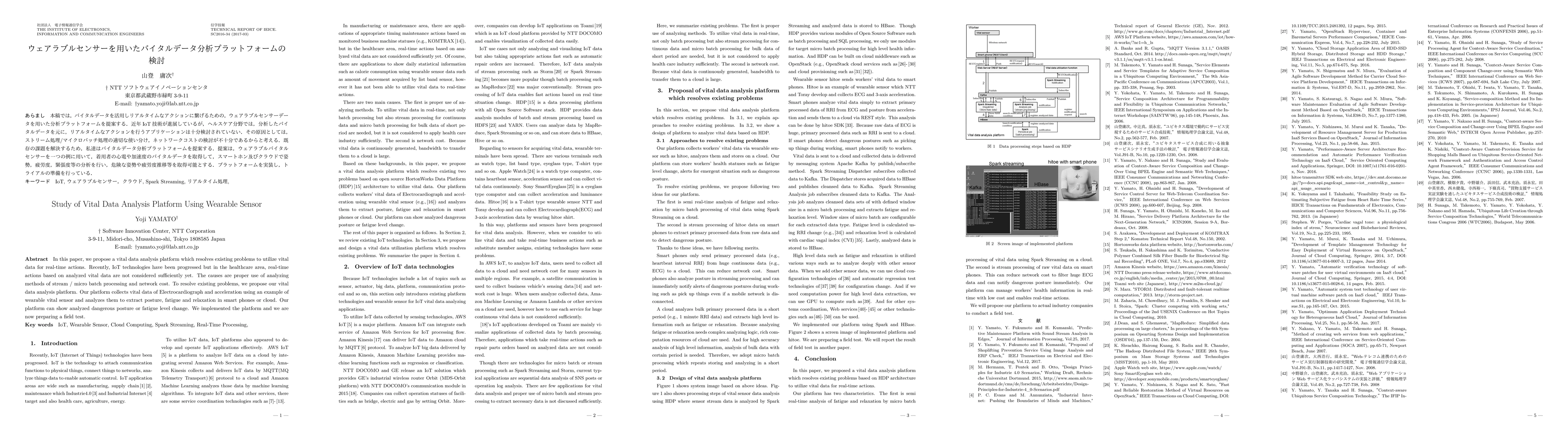 In this paper, we propose a vital data analysis platform which resolves existing problems to utilize vital data for real-time actions. Recently, IoT technologies have been progressed but in the healthcare area, real-time actions based on analyzed vital data are not considered sufficiently yet. The causes are proper use of analyzing methods of stream / micro batch processing and network cost. To resolve existing problems, we propose our vital data analysis platform. Our platform collects vital data of Electrocardiograph and acceleration using an example of wearable vital sensor and analyzes them to extract posture, fatigue and relaxation in smart phones or cloud. Our platform can show analyzed dangerous posture or fatigue level change. We implemented the platform and we are now preparing a field test.