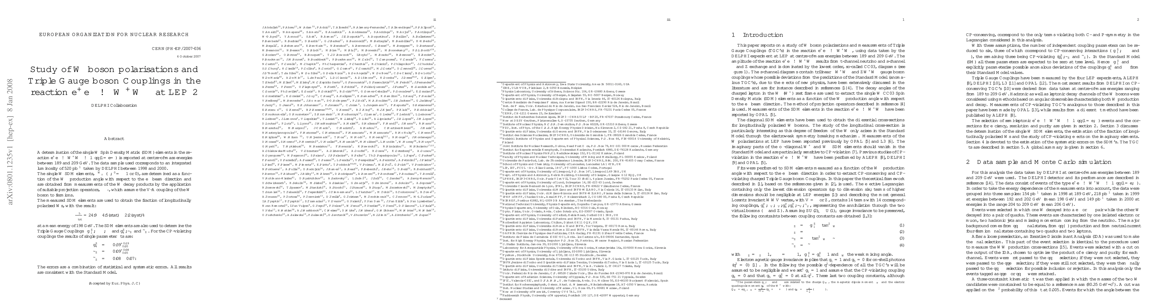 A determination of the single W Spin Density Matrix (SDM) elements in the reaction e+e- -> W+W- -> l nu q qbar (l=e/mu) is reported at centre-of-mass energies between 189 and 209 GeV. The data sample used corresponds to an integrated luminosity of 520 pb^{-1} taken by DELPHI between 1998 and 2000. The single W SDM elements, rho_{tau tau'}^{W+-} (tau,tau' = +/-1 or 0), are determined as a function of the W- production angle with respect to the e- beam direction and are obtained from measurements of the W decay products by the application of suitable projection operators, Lambda_{tau tau'}, which assume the V-A coupling of the W boson to fermions. The measured SDM elements are used to obtain the fraction of longitudinally polarised Ws, with the result: sigma_L/sigma_tot = 24.9 +/- 4.5(stat) +/- 2.2(syst) % at a mean energy of 198 GeV. The SDM elements are also used to determine the Triple Gauge Couplings Delta g_1^Z, Delta kappa_gamma, lambda_gamma and g_4^Z, kappa_Z and lambda_Z. For the CP-violating couplings the results of single parameter fits are: g_4^Z = -0.39 +0.19 -0.20 kappa_Z = -0.09 +0.08 -0.05 lambda_Z = -0.08 +/- 0.07 . The errors are a combination of statistical and systematic errors. All results are consistent with the Standard Model.