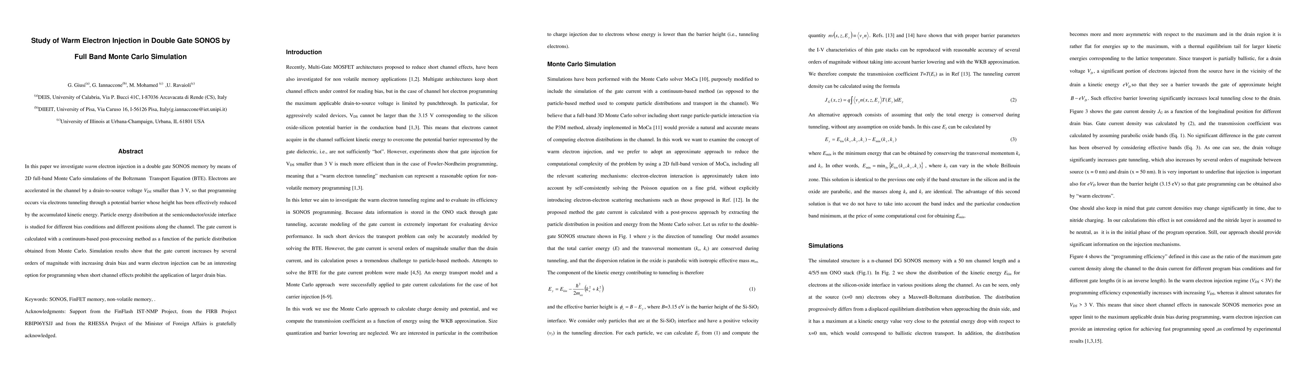 This study investigates warm electron injection in a double gate SONOS memory using full-band Monte Carlo simulations, finding that it can significantly increase gate current under certain bias conditions, offering an alternative to larger drain biases in short-channel devices.