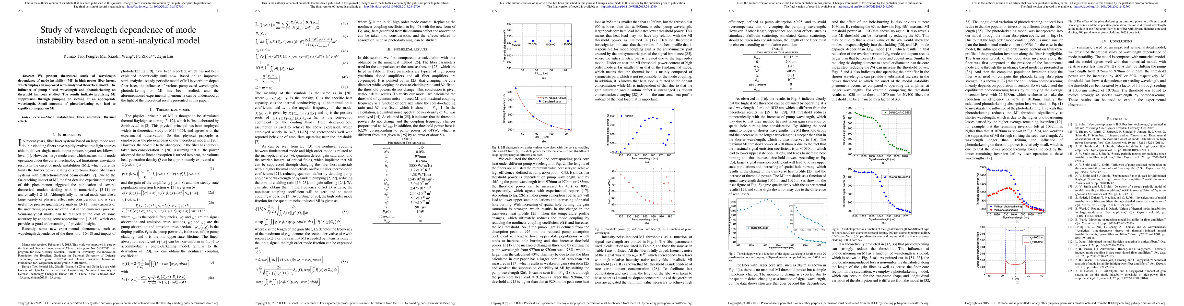 We present theoretical study of wavelength dependence of mode instability (MI) in high power fiber lasers, which employs an improved semi-analytical theoretical model. The influence of pump / seed wavelength and photodarkening on threshold has been studied. The results indicate promising MI suppression through pumping or seeding at an appropriate wavelength. Small amounts of photodarkening can lead to significant impact on MI.