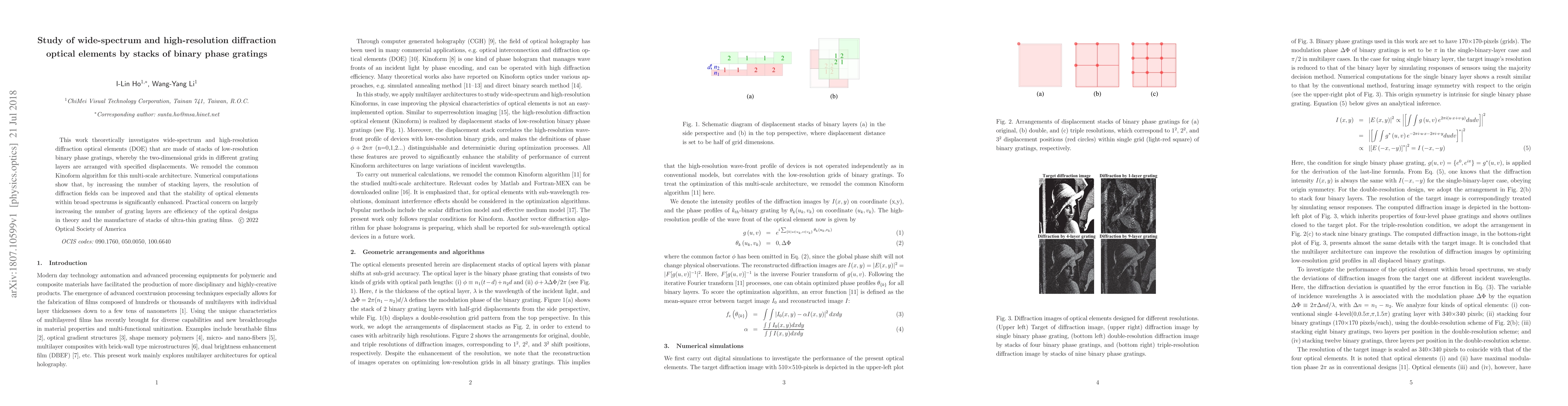 This paper investigates the use of stacked binary phase gratings to create wide-spectrum and high-resolution diffraction optical elements, enhancing resolution and stability across broad spectra. Challenges include optimizing the efficiency of optical designs and the practical manufacturing of ultra-thin grating layers.