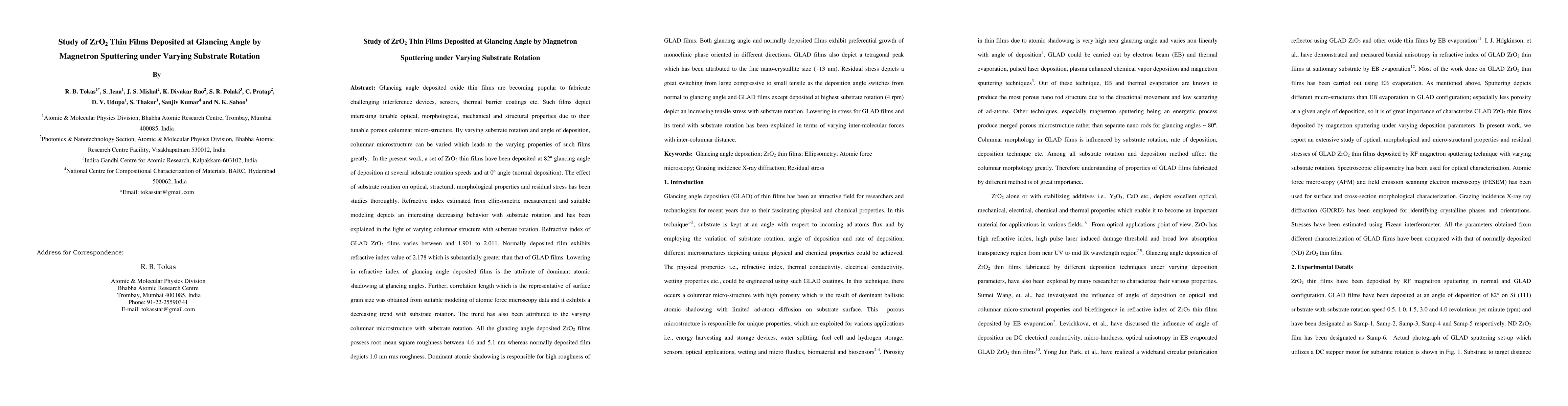 This study investigates the effects of substrate rotation on ZrO2 thin films deposited via magnetron sputtering at a glancing angle, revealing a decreasing refractive index and roughness with increased rotation, attributed to changes in columnar structure and atomic shadowing. Films show a shift from compressive to tensile residual stress with glancing angle deposition.