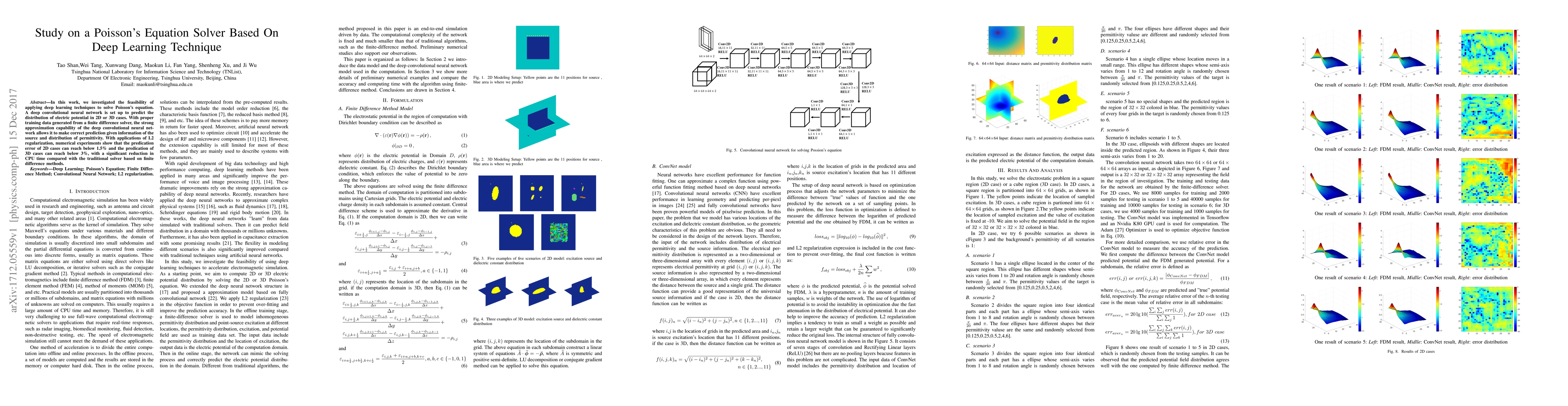In this work, we investigated the feasibility of applying deep learning techniques to solve Poisson's equation. A deep convolutional neural network is set up to predict the distribution of electric potential in 2D or 3D cases. With proper training data generated from a finite difference solver, the strong approximation capability of the deep convolutional neural network allows it to make correct prediction given information of the source and distribution of permittivity. With applications of L2 regularization, numerical experiments show that the predication error of 2D cases can reach below 1.5\% and the predication of 3D cases can reach below 3\%, with a significant reduction in CPU time compared with the traditional solver based on finite difference methods.