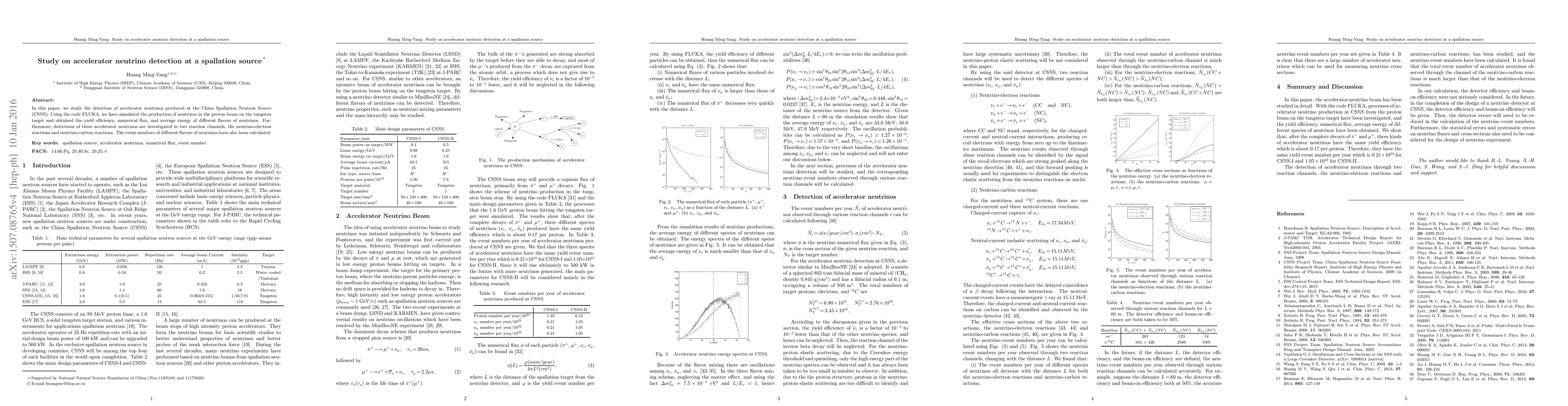 This paper investigates the detection of accelerator neutrinos at the China Spallation Neutron Source (CSNS) using the FLUKA simulation code. It analyzes the production efficiency, flux, and energy of different neutrino flavors, and explores detection via neutrino-electron and neutrino-carbon reactions, calculating event numbers for each flavor.