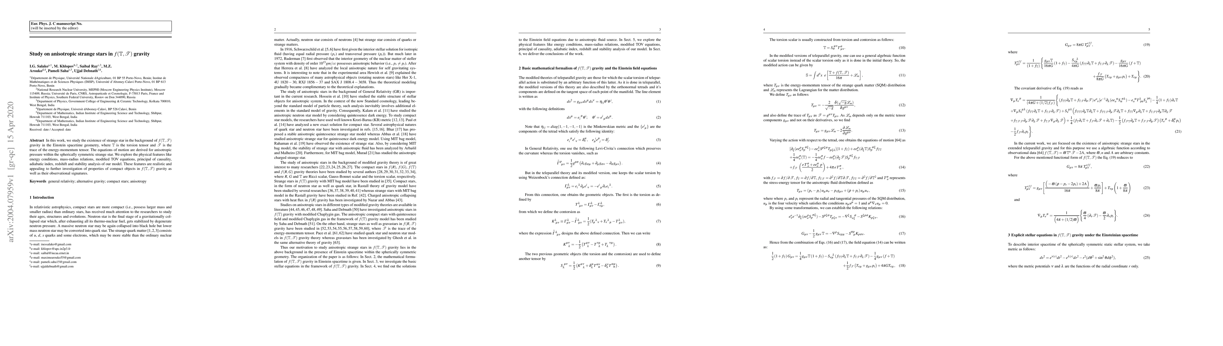 In this work, we study the existence of strange star in the background of $f(\mathbb{T},\mathcal{T})$ gravity in the Einstein spacetime geometry, where $\mathbb{T}$ is the torsion tensor and $\mathcal{T}$ is the trace of the energy-momentum tensor. The equations of motion are derived for anisotropic pressure within the spherically symmetric strange star. We explore the physical features like energy conditions, mass-radius relations, modified TOV equations, principal of causality, adiabatic index, redshift and stability analysis of our model. These features are realistic and appealing to further investigation of properties of compact objects in $f(\mathbb{T},\mathcal{T})$ gravity as well as their observational signatures.