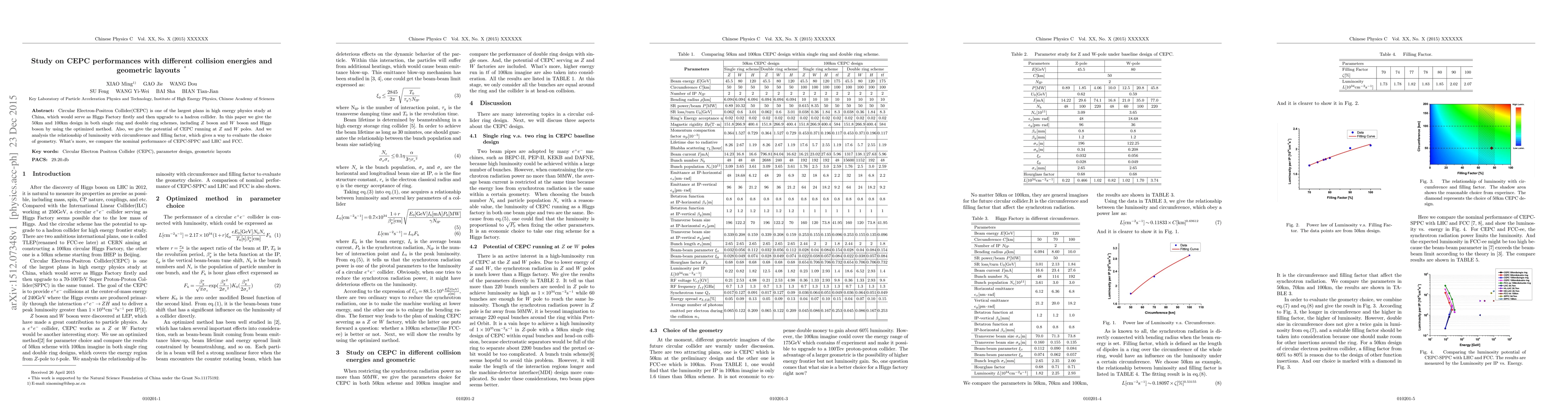 This paper evaluates the performance of China's CEPC collider under various collision energies and geometric layouts, with a focus on optimizing luminosity and comparing to other colliders like LHC and FCC.