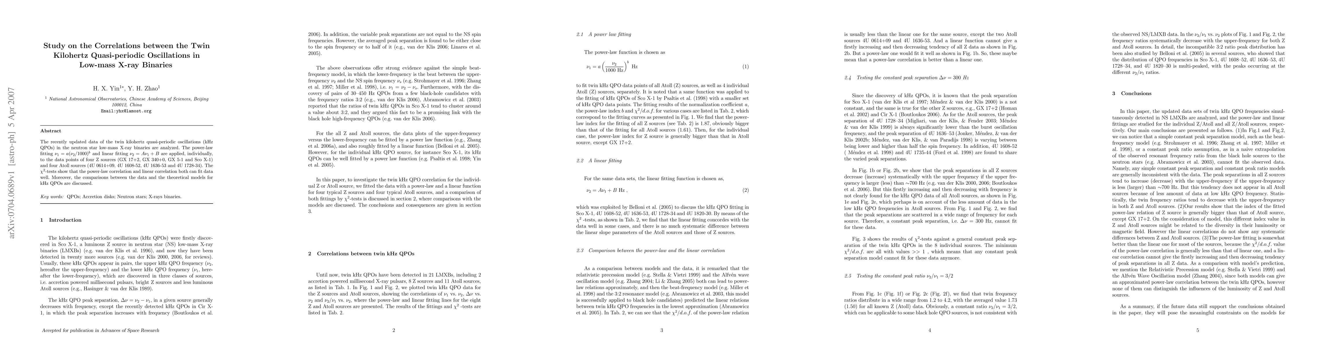 This study analyzes twin kilohertz quasi-periodic oscillations (kHz QPOs) in neutron star low-mass X-ray binaries using power-law and linear fitting methods. Both fitting approaches show good correlation with the data from eight different sources, and comparisons with theoretical models are also discussed.