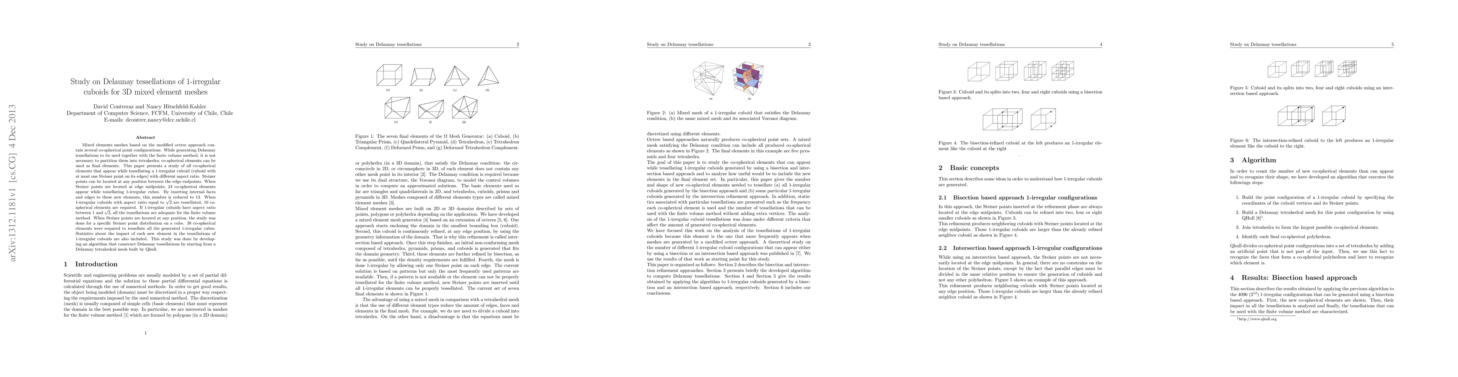 Mixed elements meshes based on the modified octree approach contain several co-spherical point configurations. While generating Delaunay tessellations to be used together with the finite volume method, it is not necessary to partition them into tetrahedra; co-spherical elements can be used as final elements. This paper presents a study of all co-spherical elements that appear while tessellating a 1-irregular cuboid (cuboid with at most one Steiner point on its edges) with different aspect ratio. Steiner points can be located at any position between the edge endpoints. When Steiner points are located at edge midpoints, 24 co-spherical elements appear while tessellating 1-irregular cubes. By inserting internal faces and edges to these new elements, this number is reduced to 13. When 1-irregular cuboids with aspect ratio equal to $\sqrt{2}$ are tessellated, 10 co-spherical elements are required. If 1-irregular cuboids have aspect ratio between 1 and $\sqrt{2}$, all the tessellations are adequate for the finite volume method. When Steiner points are located at any position, the study was done for a specific Steiner point distribution on a cube. 38 co-spherical elements were required to tessellate all the generated 1-irregular cubes. Statistics about the impact of each new element in the tessellations of 1-irregular cuboids are also included. This study was done by developing an algorithm that construct Delaunay tessellations by starting from a Delaunay tetrahedral mesh built by Qhull.
