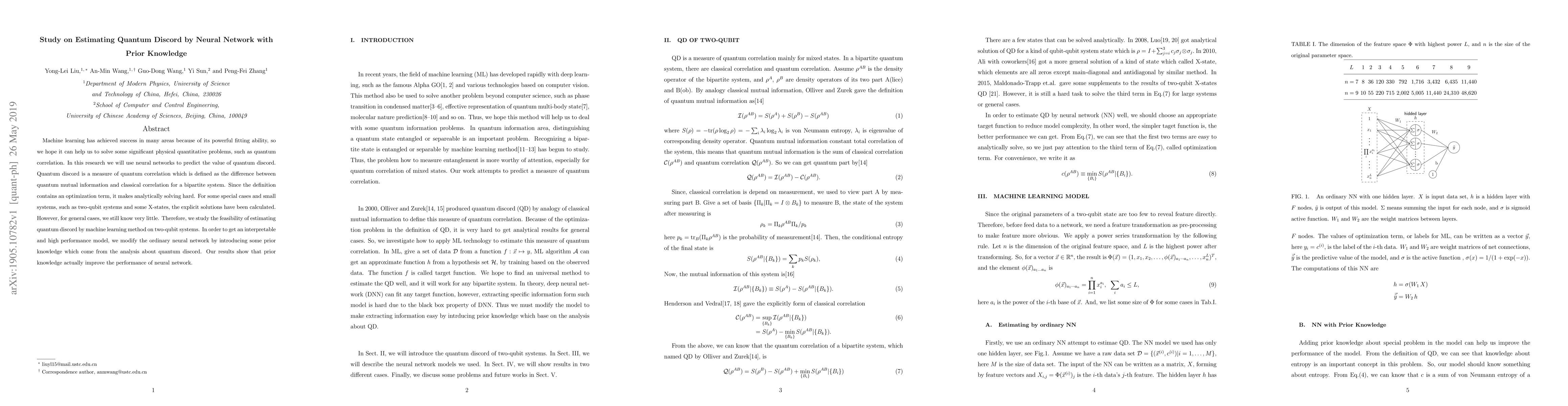 This research employs neural networks enhanced with prior knowledge to predict quantum discord, a measure of quantum correlation, for two-qubit systems. The study demonstrates that incorporating analytical insights about quantum discord into the neural network model improves its performance and interpretability.