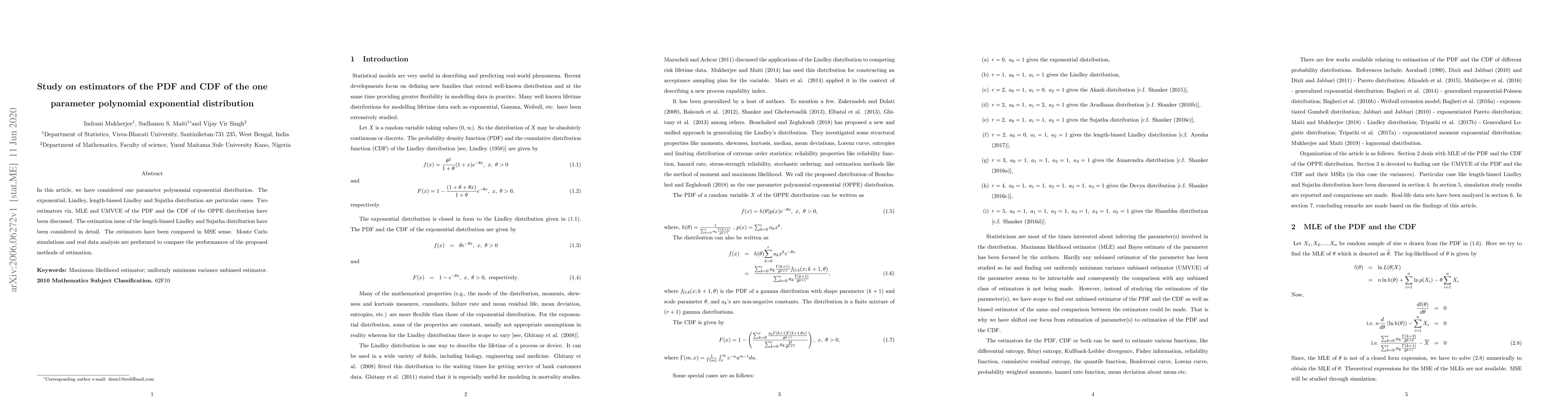 In this article, we have considered one parameter polynomial exponential (OPPE) distribution. The exponential, Lindley, length-biased Lindley and Sujatha distribution are particular cases. Two estimators viz, MLE and UMVUE of the PDF and the CDF of the OPPE distribution have been discussed. The estimation issue of the length-biased Lindley and Sujatha distribution have been considered in detail. The estimators have been compared in MSE sense. Monte Carlo simulations and real data analysis are performed to compare the performances of the proposed methods of estimation.