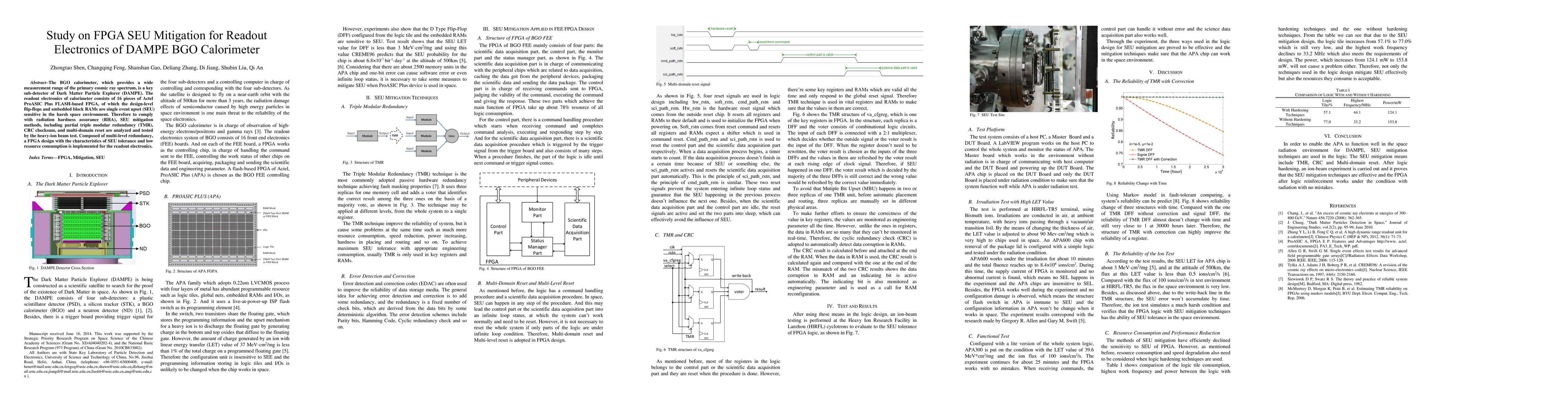 This study investigates SEU mitigation strategies for the FPGA-based readout electronics of DAMPE's BGO calorimeter, employing partial TMR, CRC checksum, and multi-domain reset methods. The implemented FPGA design achieves SEU tolerance and low resource consumption, validated through heavy-ion beam tests.