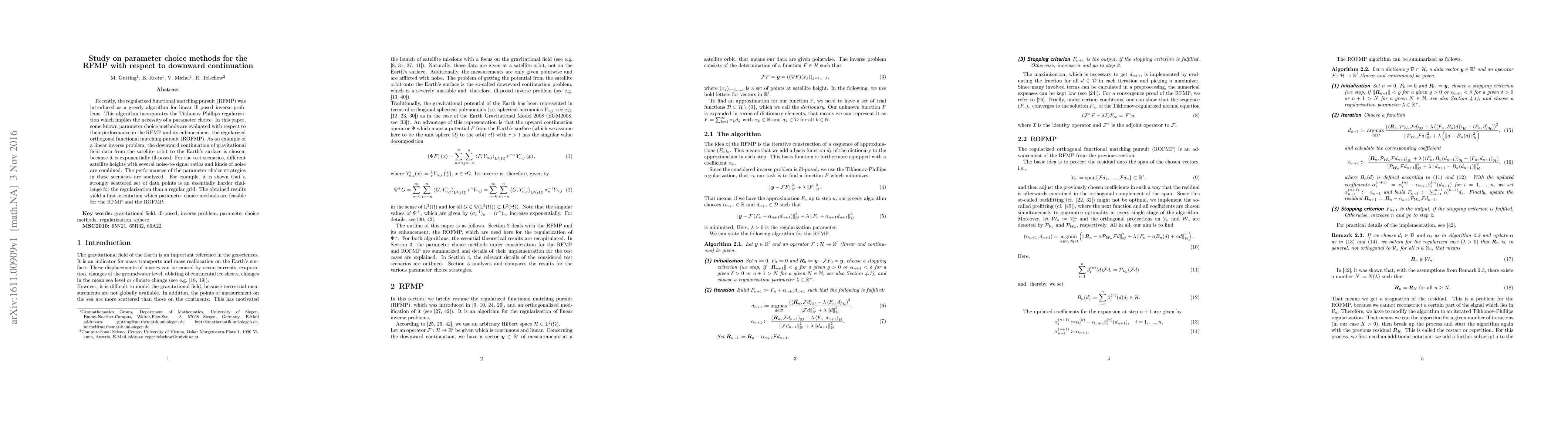 Recently, the regularized functional matching pursuit (RFMP) was introduced as a greedy algorithm for linear ill-posed inverse problems. This algorithm incorporates the Tikhonov-Phillips regularization which implies the necessity of a parameter choice. In this paper, some known parameter choice methods are evaluated with respect to their performance in the RFMP and its enhancement, the regularized orthogonal functional matching pursuit (ROFMP). As an example of a linear inverse problem, the downward continuation of gravitational field data from the satellite orbit to the Earth's surface is chosen, because it is exponentially ill-posed. For the test scenarios, different satellite heights with several noise-to-signal ratios and kinds of noise are combined. The performances of the parameter choice strategies in these scenarios are analyzed. For example, it is shown that a strongly scattered set of data points is an essentially harder challenge for the regularization than a regular grid. The obtained results yield a first orientation which parameter choice methods are feasible for the RFMP and the ROFMP.