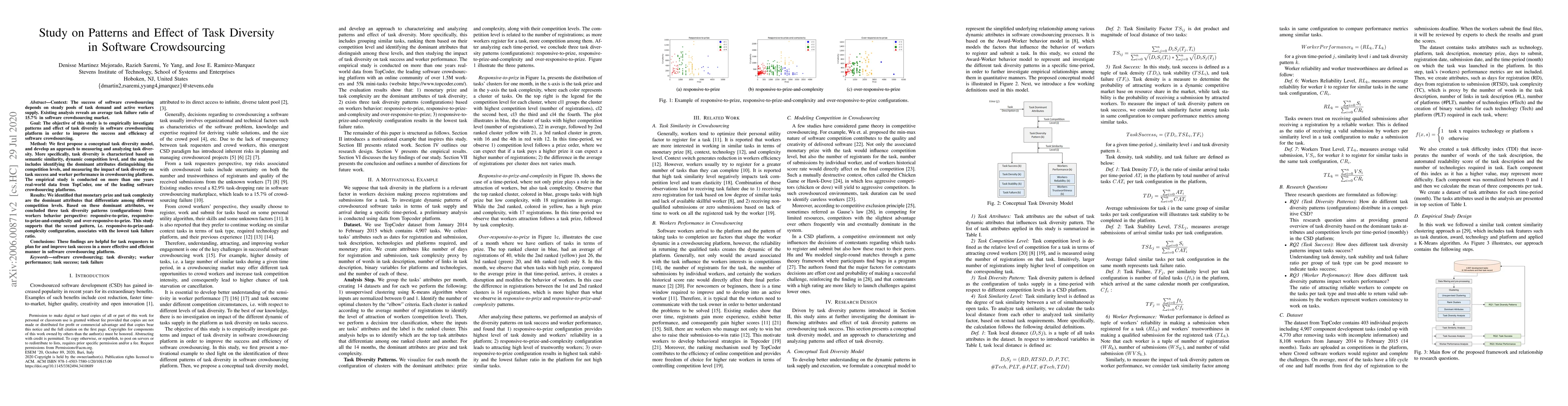 This study identifies task diversity patterns in software crowdsourcing, finding that configurations responsive to prize offer high task density and worker reliability, while responsive to prize and complexity attracts trustworthy workers. Over responsive to prize configurations ensure task stability and lowest failure ratios for diverse tasks.