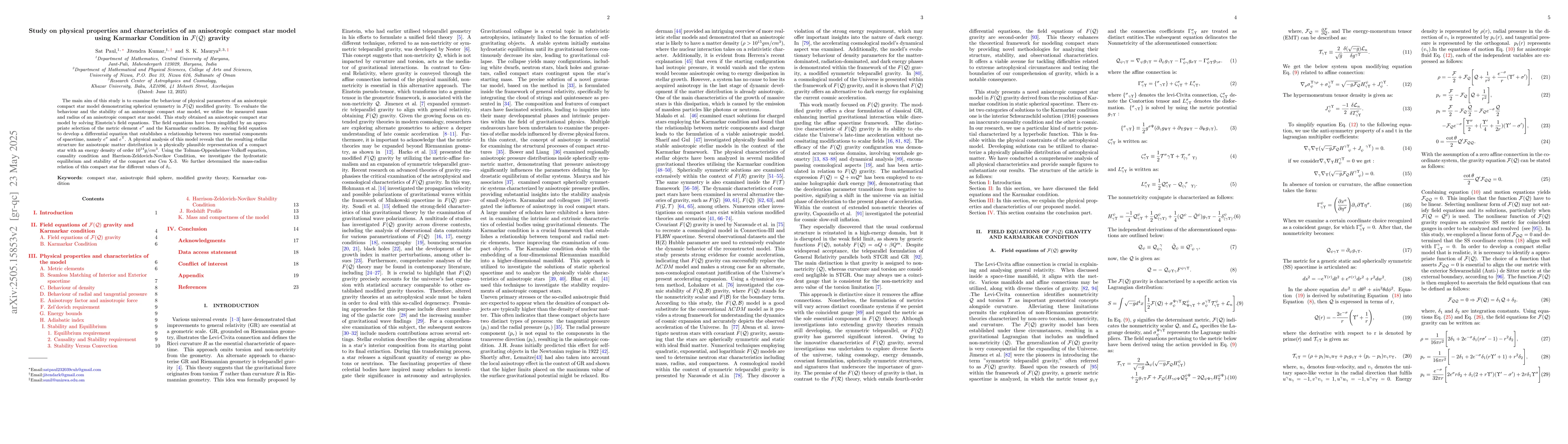 The study utilizes Einstein field equations simplified by selecting appropriate metric elements and applying the Karmarkar condition in F(Q) modified gravity to develop a differential equation relating spacetime components for an anisotropic compact star model.