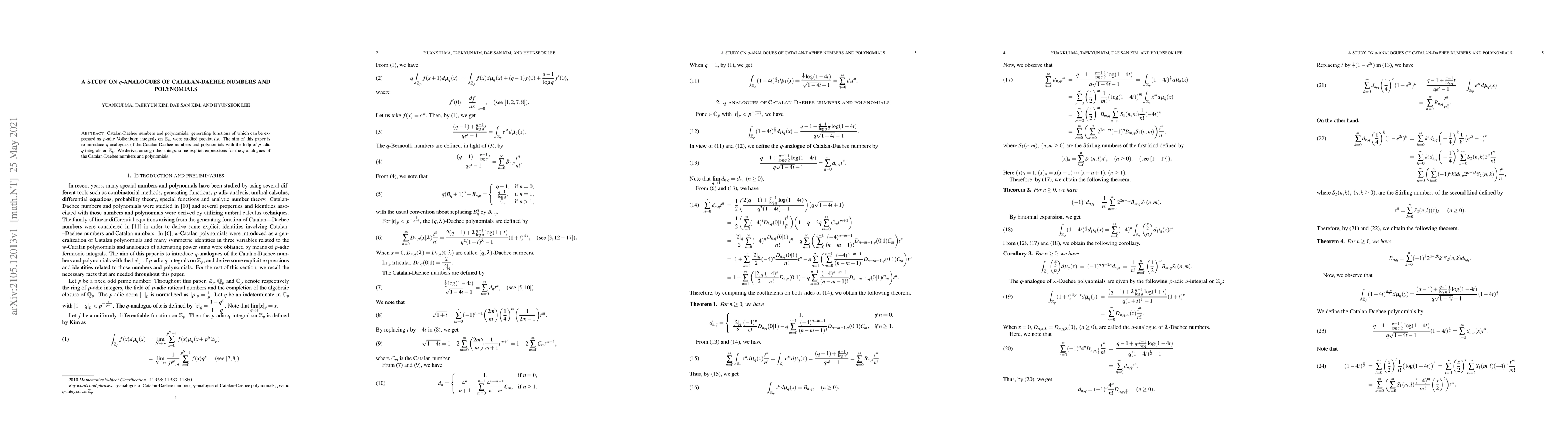 This paper introduces q-analogues of Catalan-Daehee numbers and polynomials using p-adic q-integrals on Zp. It derives explicit expressions for these new q-analogues, extending previous studies on their generating functions.