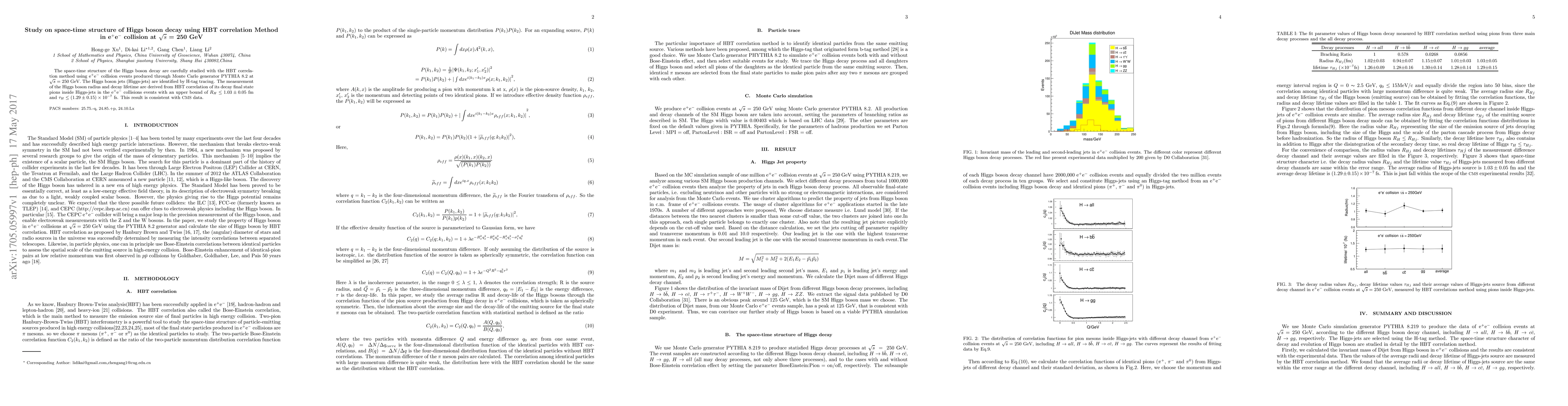The space-time structure of the Higgs boson decay are carefully studied with the HBT correlation method using e$^+$e$^-$ collision events produced through Monte Carlo generator PYTHIA 8.2 at $\sqrt{s}$=250GeV. The Higgs boson jets (Higgs-jets) are identified by H-tag tracing. The measurement of the Higgs boson radius and decay lifetime are derived from HBT correlation of its decay final state pions inside Higgs-jets in the e$^+$e$^-$ collisions events with an upper bound of $R_H \le 1.03\pm 0.05$ fm and $\tau_H \le (1.29\pm0.15)\times 10^{-7}$ fs. This result is consistent with CMS data.