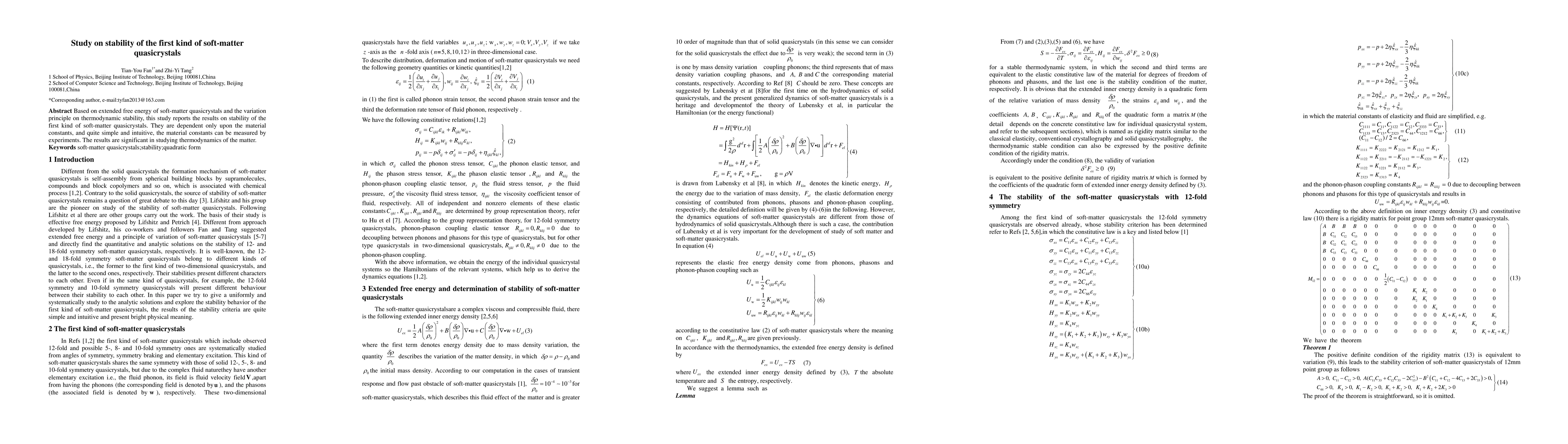 This study investigates the thermodynamic stability of the first kind of soft-matter quasicrystals using extended free energy and the variation principle. The findings show that stability depends solely on measurable material constants, providing significant insights into the thermodynamics of such materials.