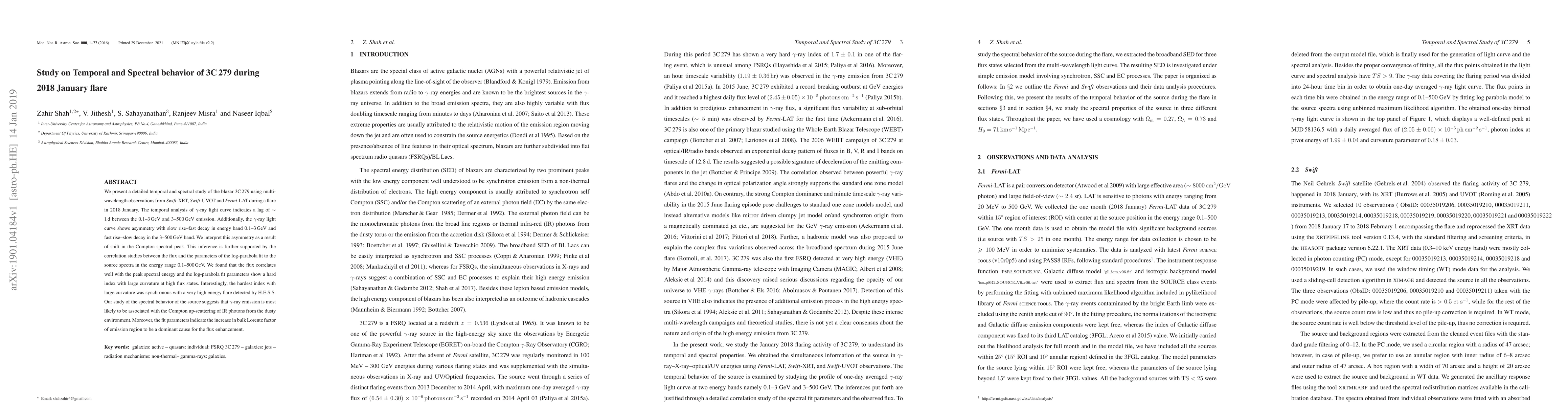 We present a detailed temporal and spectral study of the blazar 3C\,279 using multi-wavelength observations from Swift-XRT, Swift-UVOT and Fermi-LAT during a flare in 2018 January. The temporal analysis of $\gamma$-ray light curve indicates a lag of $\sim 1$ d between the 0.1--3 GeV and 3--500 GeV emission. Additionally, the $\gamma$-ray light curve shows asymmetry with slow rise--fast decay in energy band 0.1--3 GeV and fast rise--slow decay in the 3--500 GeV band. We interpret this asymmetry as a result of shift in the Compton spectral peak. This inference is further supported by the correlation studies between the flux and the parameters of the log-parabola fit to the source spectra in the energy range 0.1--500 GeV. We found that the flux correlates well with the peak spectral energy and the log-parabola fit parameters show a hard index with large curvature at high flux states. Interestingly, the hardest index with large curvature was synchronous with a very high energy flare detected by H.E.S.S. Our study of the spectral behavior of the source suggests that $\gamma$-ray emission is most likely to be associated with the Compton up-scattering of IR photons from the dusty environment. Moreover, the fit parameters indicate the increase in bulk Lorentz factor of emission region to be a dominant cause for the flux enhancement.