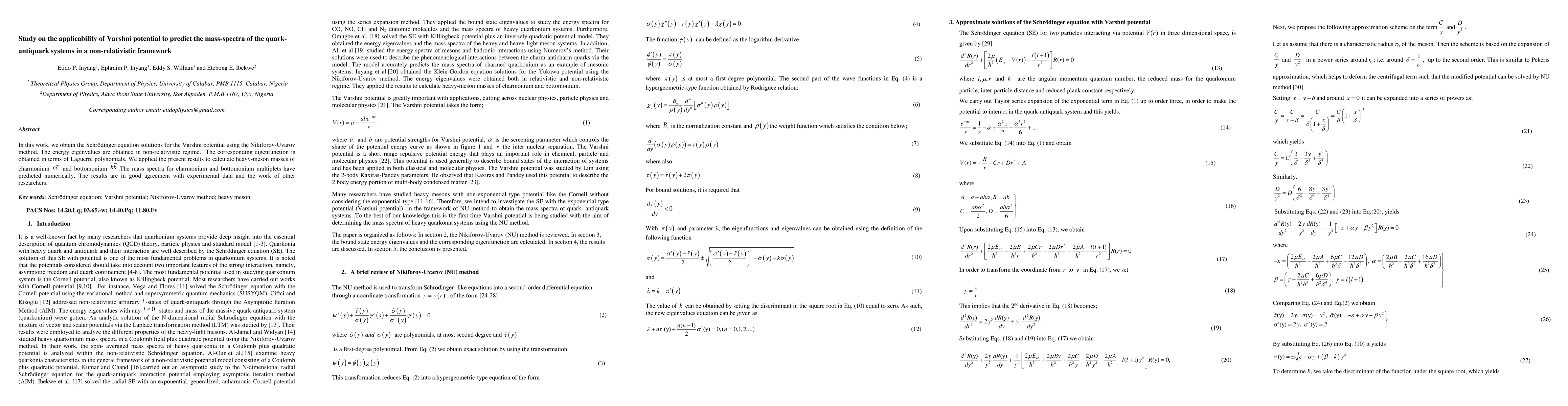 In this work, we obtain the Schr\"odinger equation solutions for the Varshni potential using the Nikiforov-Uvarov method. The energy eigenvalues are obtained in non-relativistic regime. The corresponding eigenfunction is obtained in terms of Laguerre polynomials. We applied the present results to calculate heavy-meson masses of charmonium and bottomonium .The mass spectra for charmonium and bottomonium multiplets have predicted numerically. The results are in good agreement with experimental data and the work of other researchers.