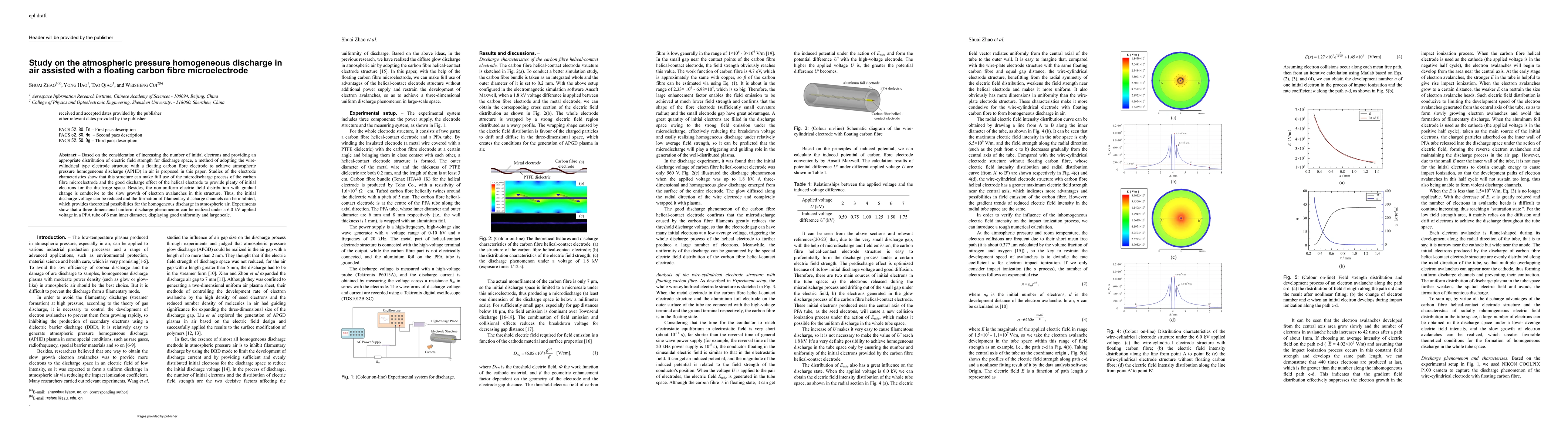 Based on the consideration of increasing the number of initial electrons and providing an appropriate distribution of electric field strength for discharge space, a method of adopting the wire-cylindrical type electrode structure with a floating carbon fibre electrode to achieve atmospheric pressure homogeneous discharge (APHD) in air is proposed in this paper. Studies of the electrode characteristics show that this structure can make full use of the microdischarge process of the carbon fibre microelectrode and the good discharge effect of the helical electrode to provide plenty of initial electrons for the discharge space. Besides, the non-uniform electric field distribution with gradual change is conducive to the slow growth of electron avalanches in this structure. Thus, the initial discharge voltage can be reduced and the formation of filamentary discharge channels can be inhibited, which provides theoretical possibilities for the homogeneous discharge in atmospheric air. Experiments show that a three-dimensional uniform discharge phenomenon can be realized under a 6.0 kV applied voltage in a PFA tube of 6 mm inner diameter, displaying good uniformity and large scale.